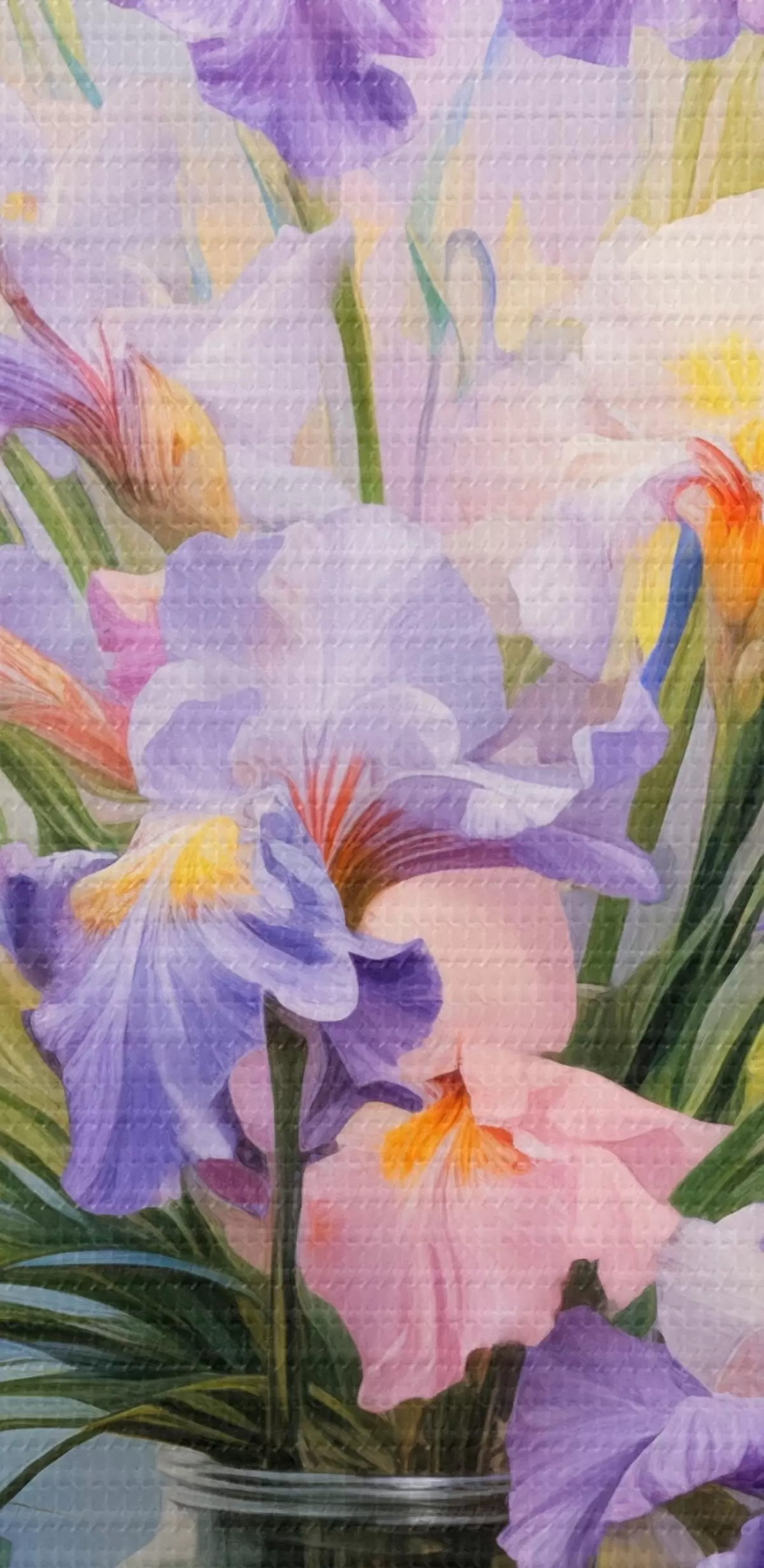Schilderij Een vaas met veel pastelkleurige irissen, enkele bloemblaadjes verspreid op tafel, zachte pastelkleurige achtergrond met blauwe en roze tinten Art. s44933