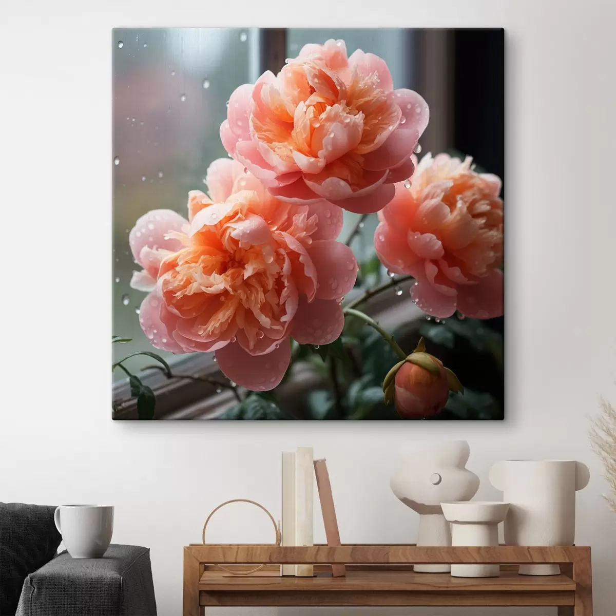 Schilderij Drie pioenrozen met dauw in ochtendlicht Art. s45033
