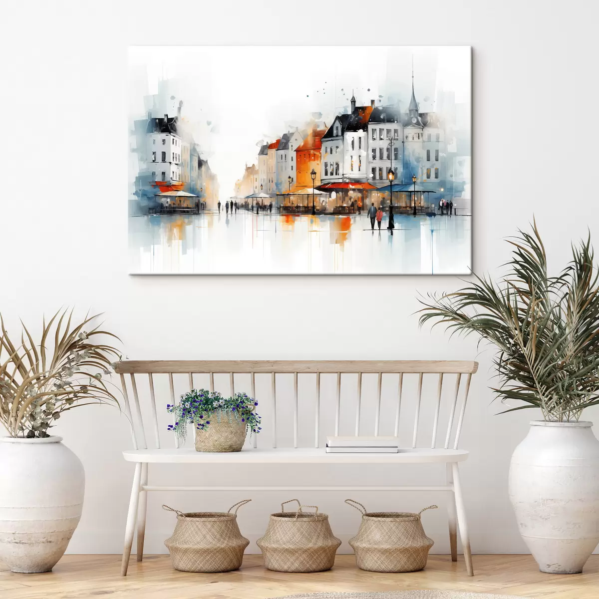 Schilderij Straatbeeld met gebouwen en mensen in artistieke stijl Art. s45050