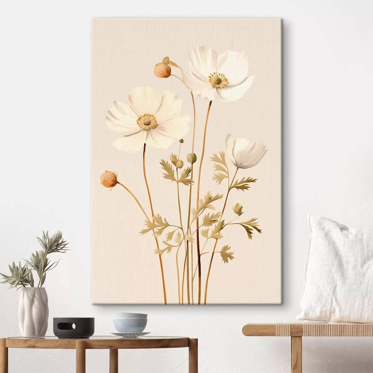 Schilderij bloem, botanisch, beige achtergrond, zachte tinten, bloemblaadjes, plant, vintage, minimaal Art. s45099