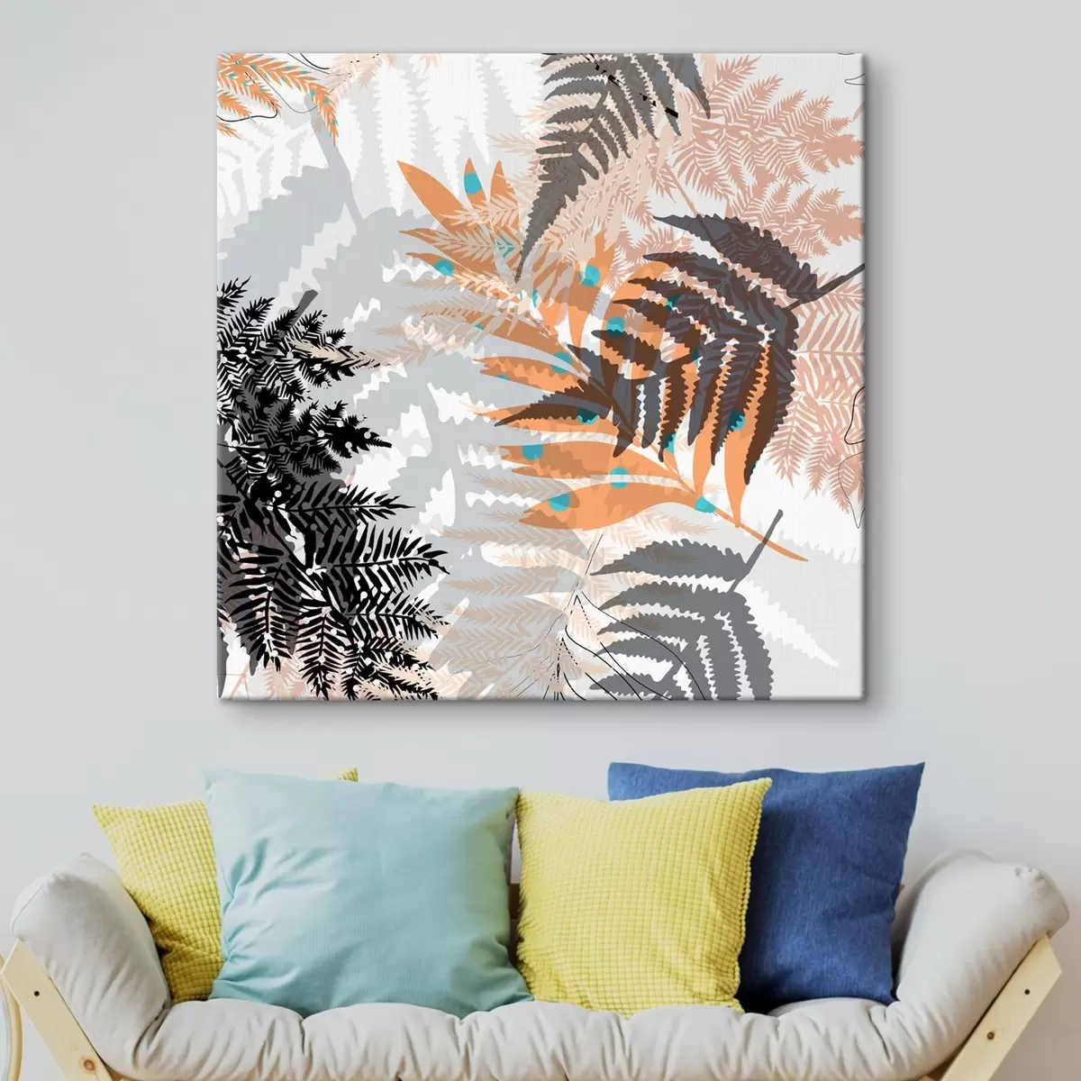 Schilderijen jungle gebladerte, moderne stijl, lijntekeningen, gelaagde planten, gedempte kleuren, natuur s45102