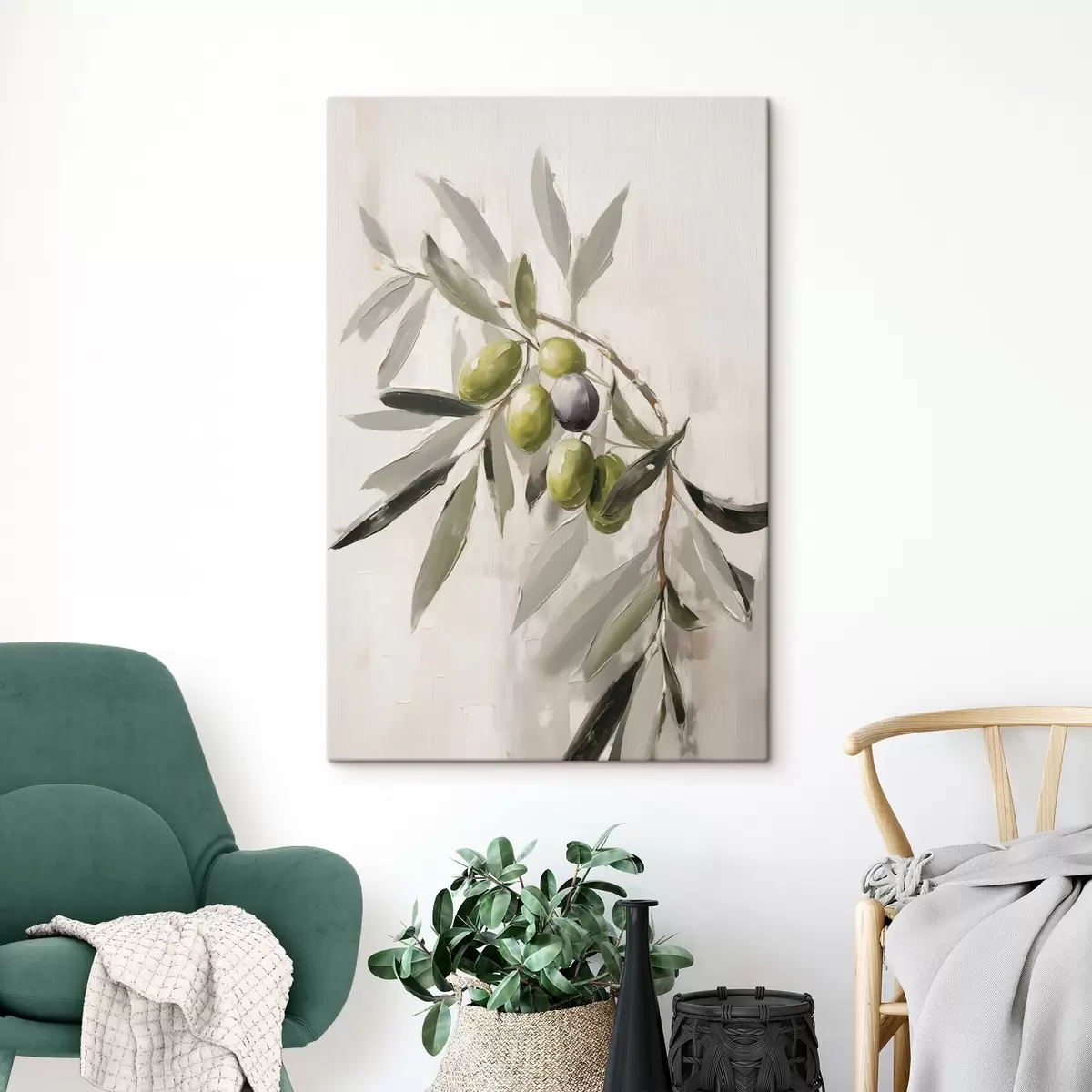 Schilderij groene olijven, takdetail, lichte achtergrond, organisch, natuurlijk palet, rustiek Art. s45110