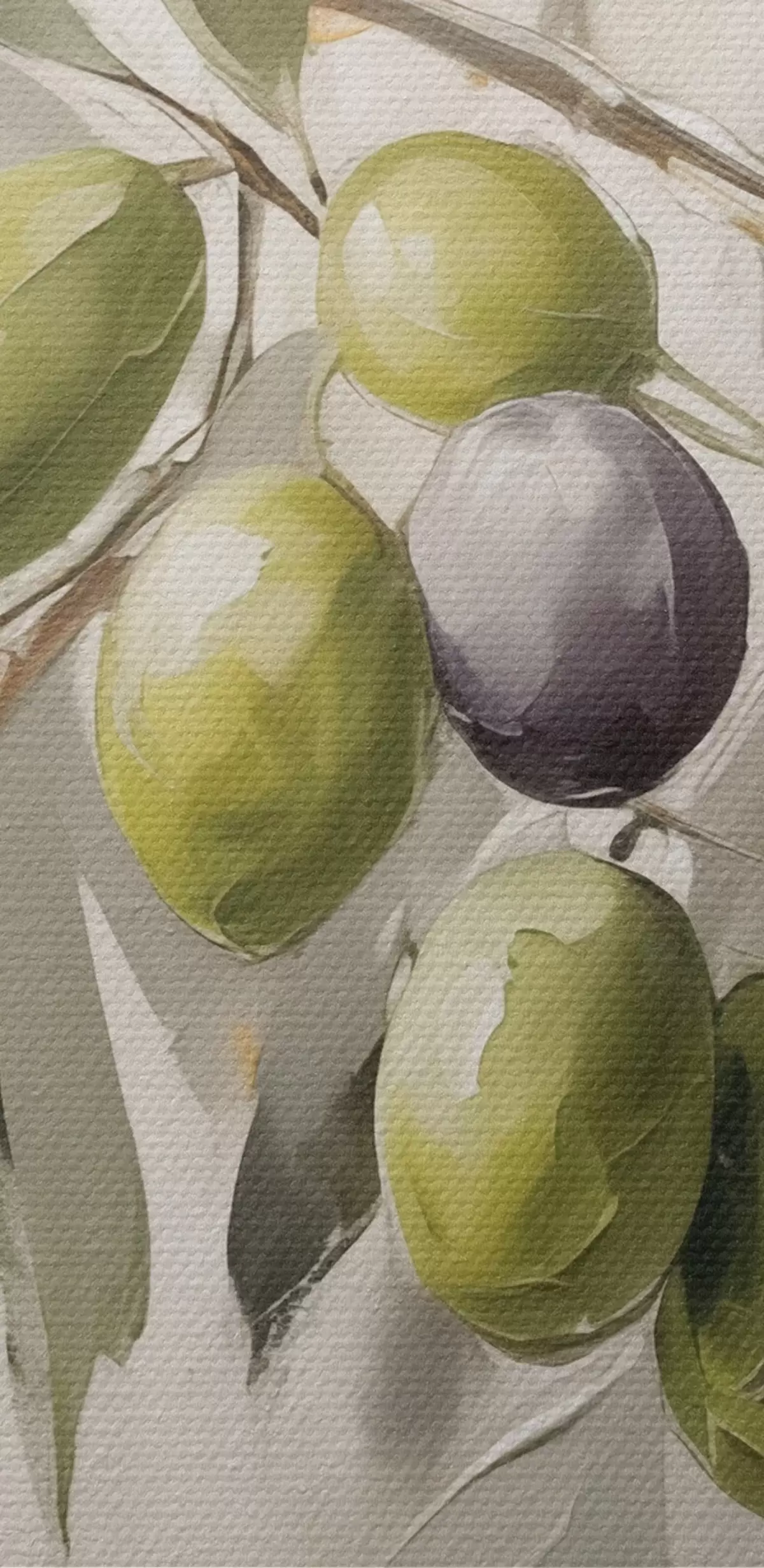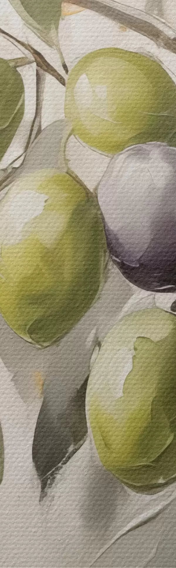 Schilderijen groene olijven, takdetail, lichte achtergrond, organisch, natuurlijk palet, rustiek s45110