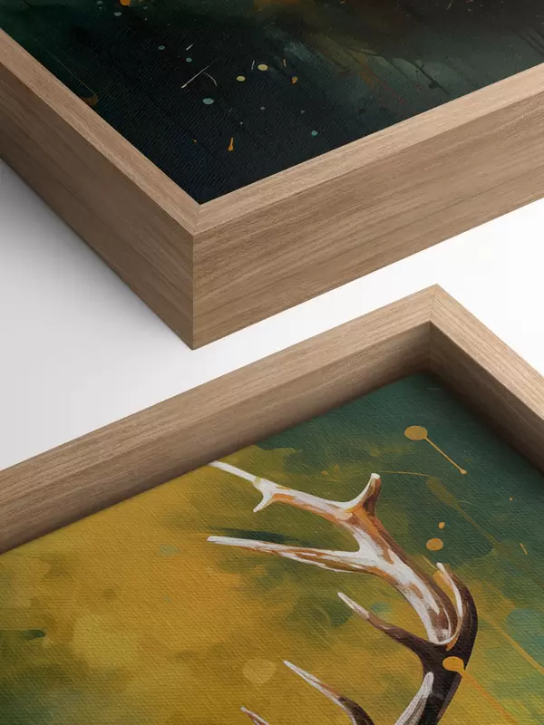 Schilderijen hert, gewei, bosgroen, oranje spetter, dierenportret, verfdruppel, vet, wilde dieren s45111