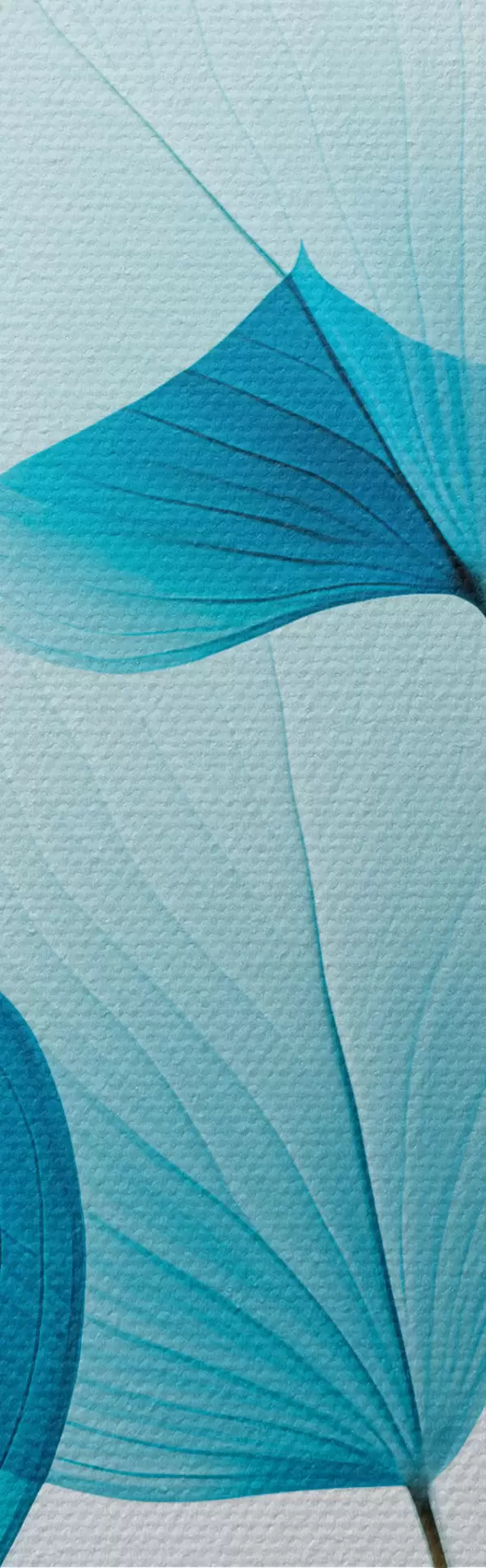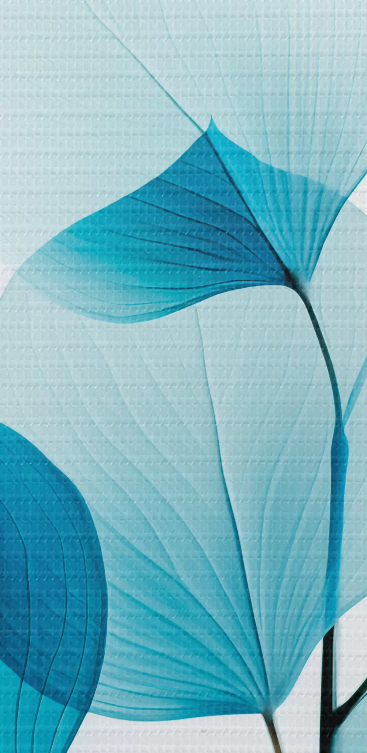 Schilderij Tak met doorschijnende blauwe bladeren, fijne nerven zichtbaar, lichte en rustige compositie, minimalistische esthetiek Art. s45175