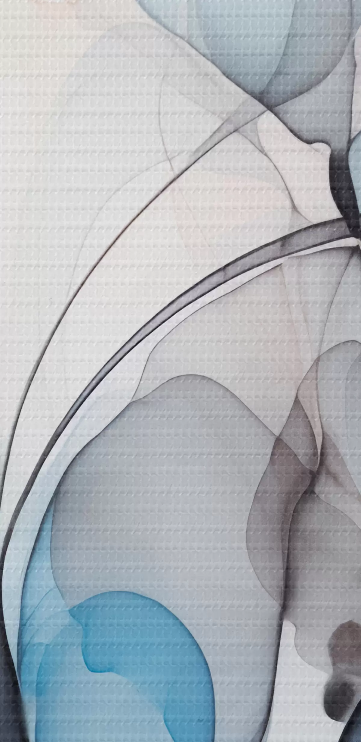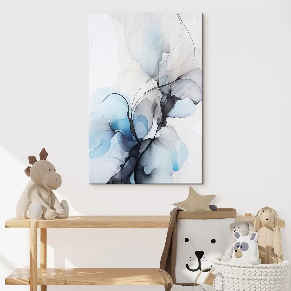 Schilderij Abstracte compositie met vloeiende lijnen en doorschijnende bloemblaadjes in blauwwitte en beige tinten, imitatie van alcoholinkt Art. s45177