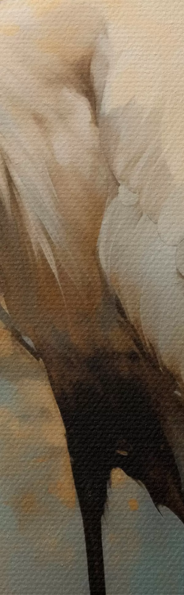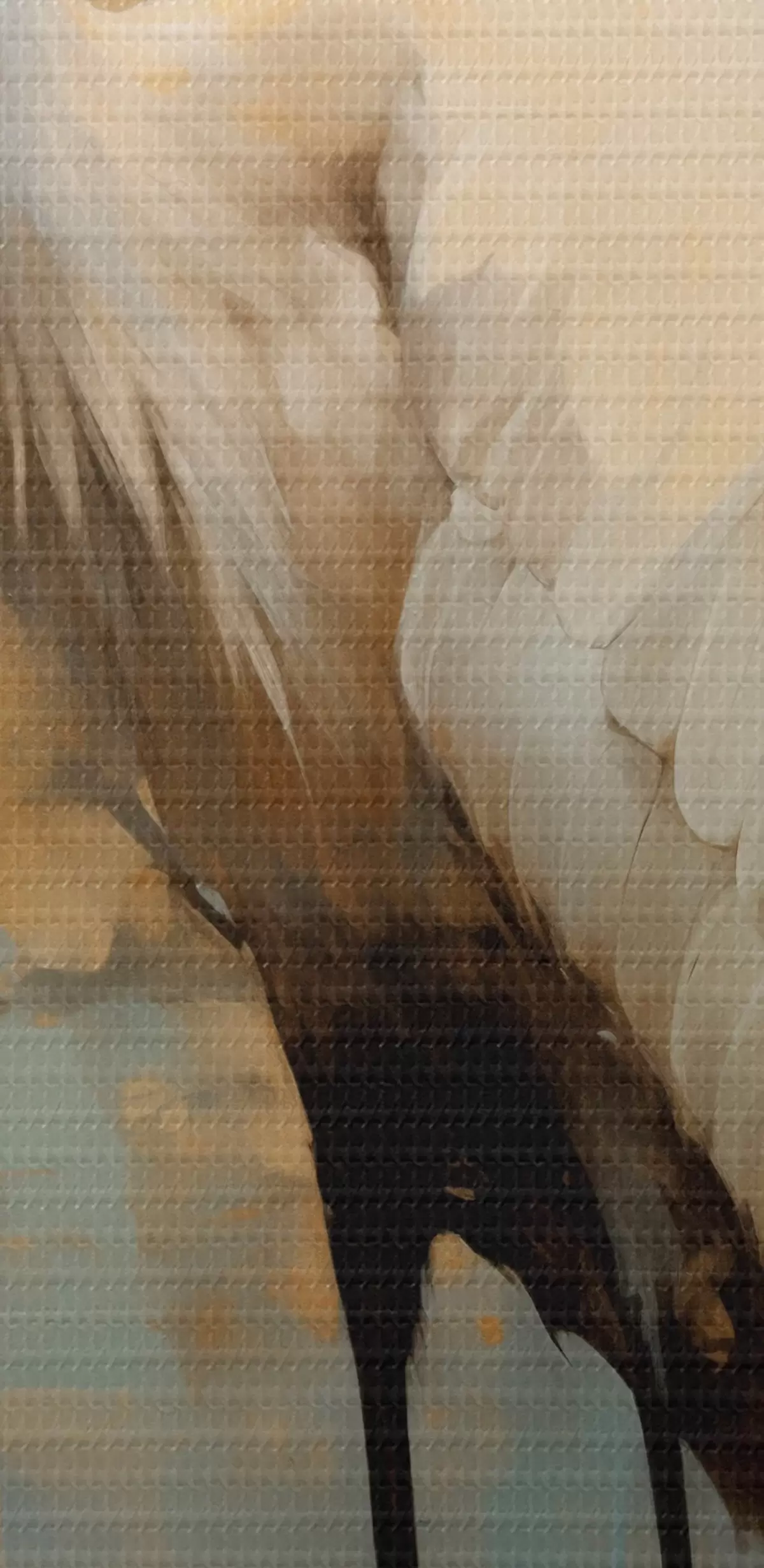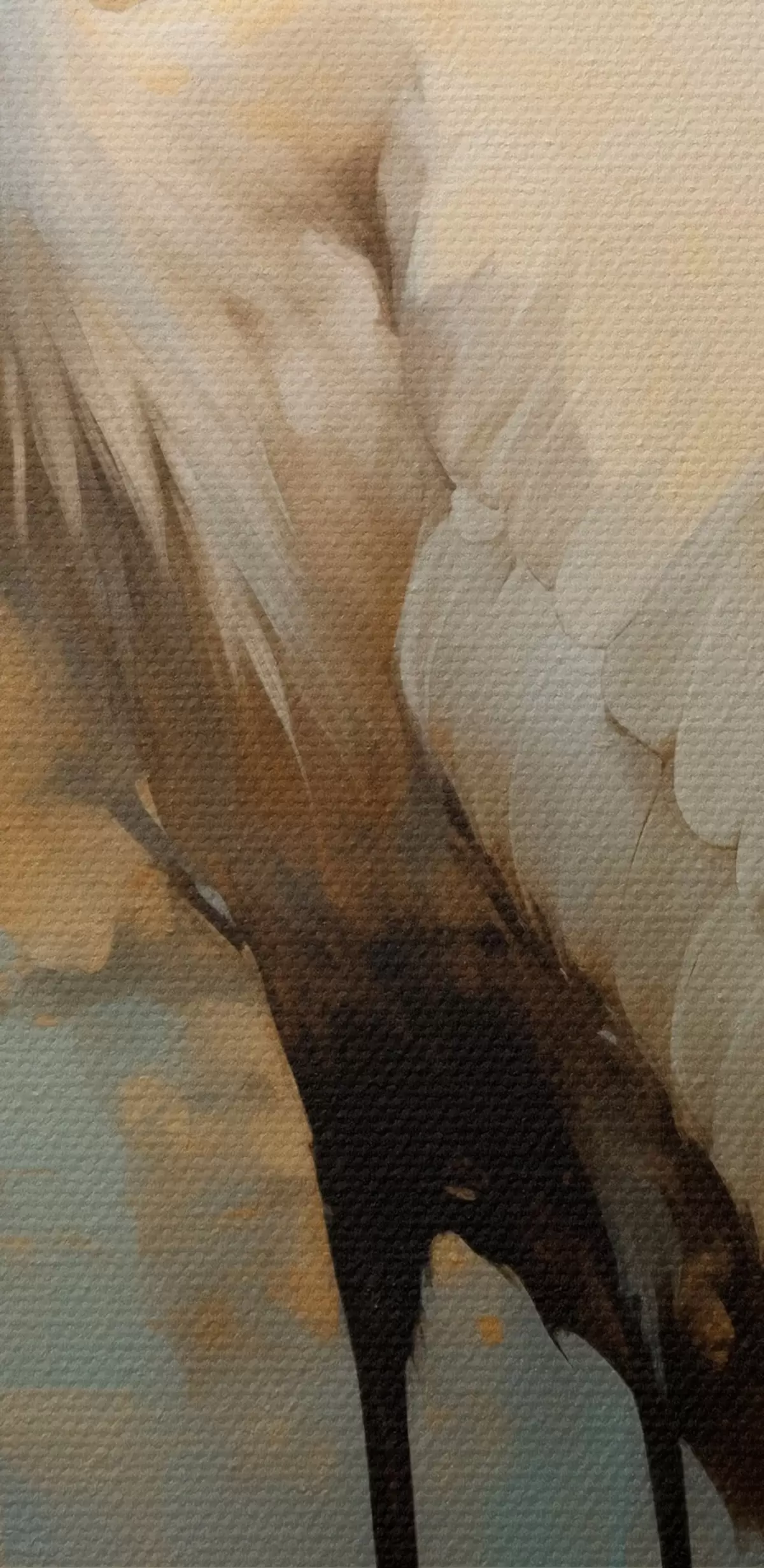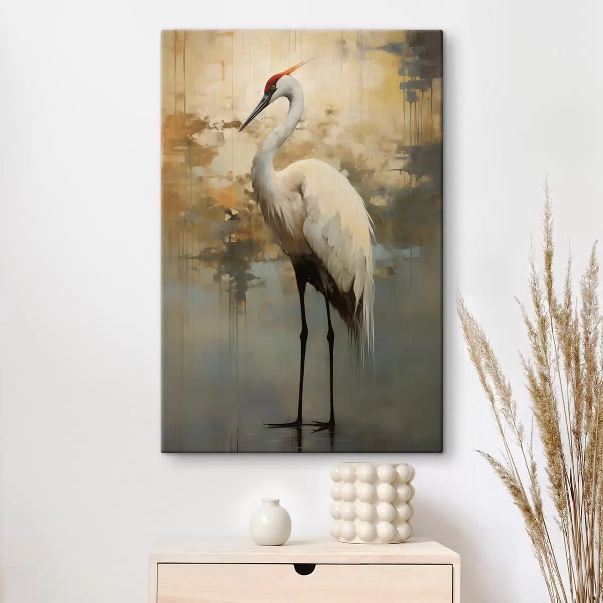 Schilderij Witte reiger tegen een achtergrond van gedempte gele, bruine en blauwe tinten die een mistig, abstract landschap suggereren Art. s45192