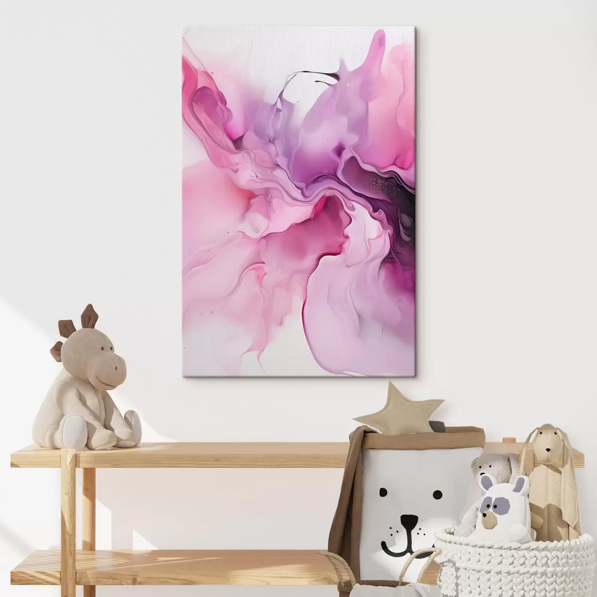Schilderij Abstracte wervelingen van roze, paars en zwart smelten samen in een vloeiende, organische compositie en creëren een gevoel van beweging Art. s45195