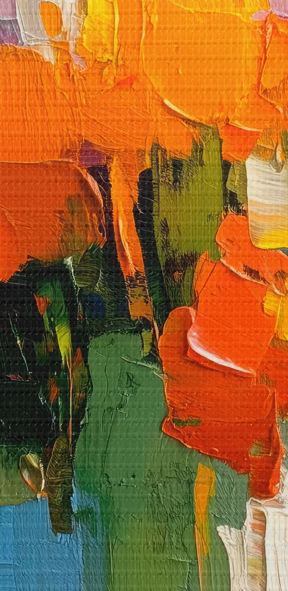 Het schilderij kan direct na ontvangst worden opgehangen. Het schilderij wordt opgespannen op een 2 cm breed houten spieraam.