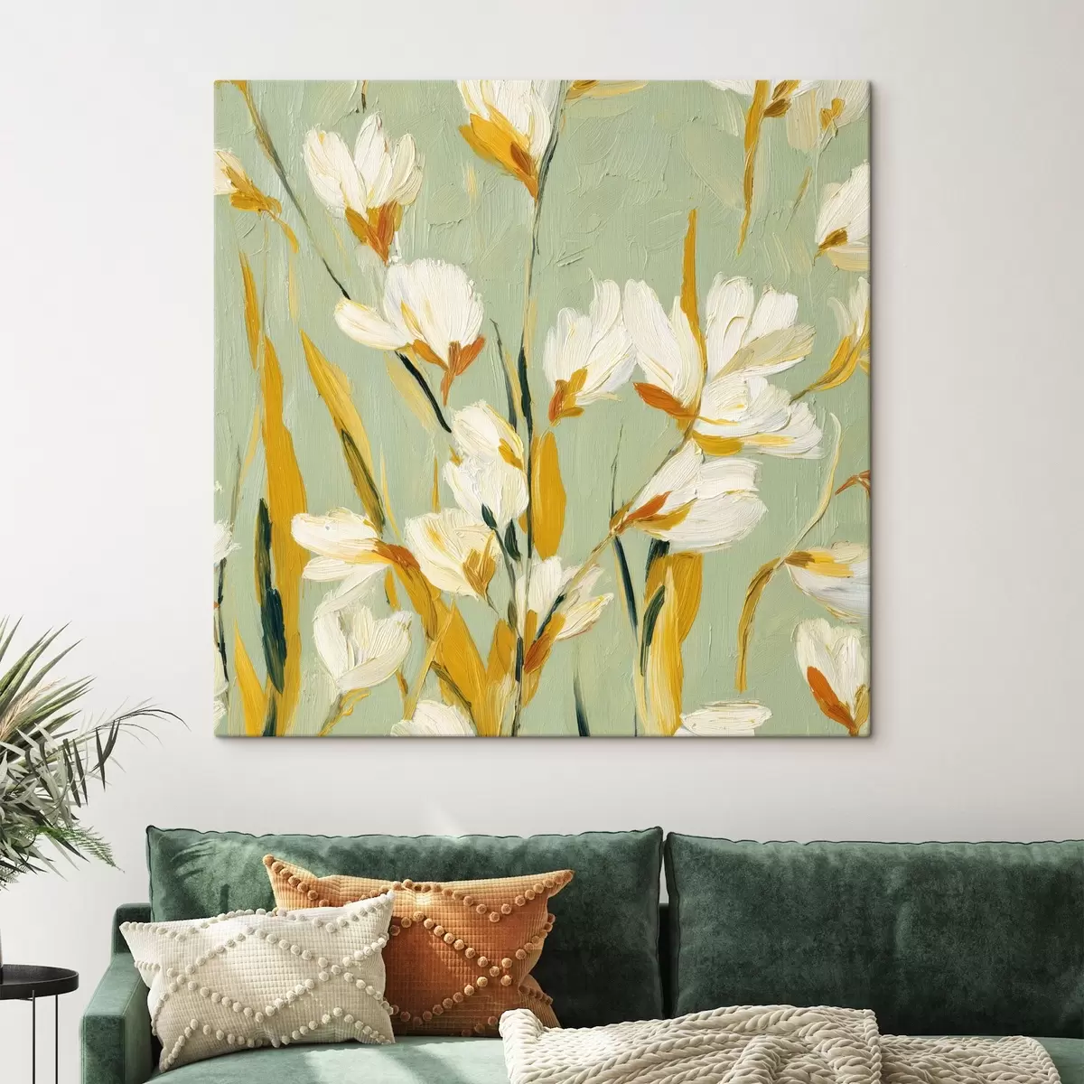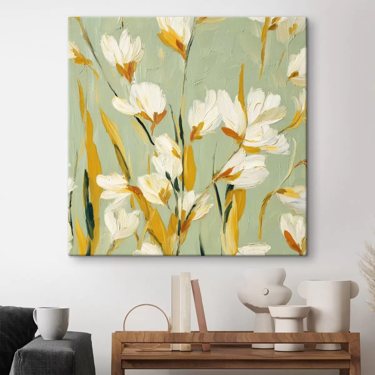 Schilderij Witte bloemen met gele accenten op een mintkleurige achtergrond in penseelstrekenstijl Art. s45264