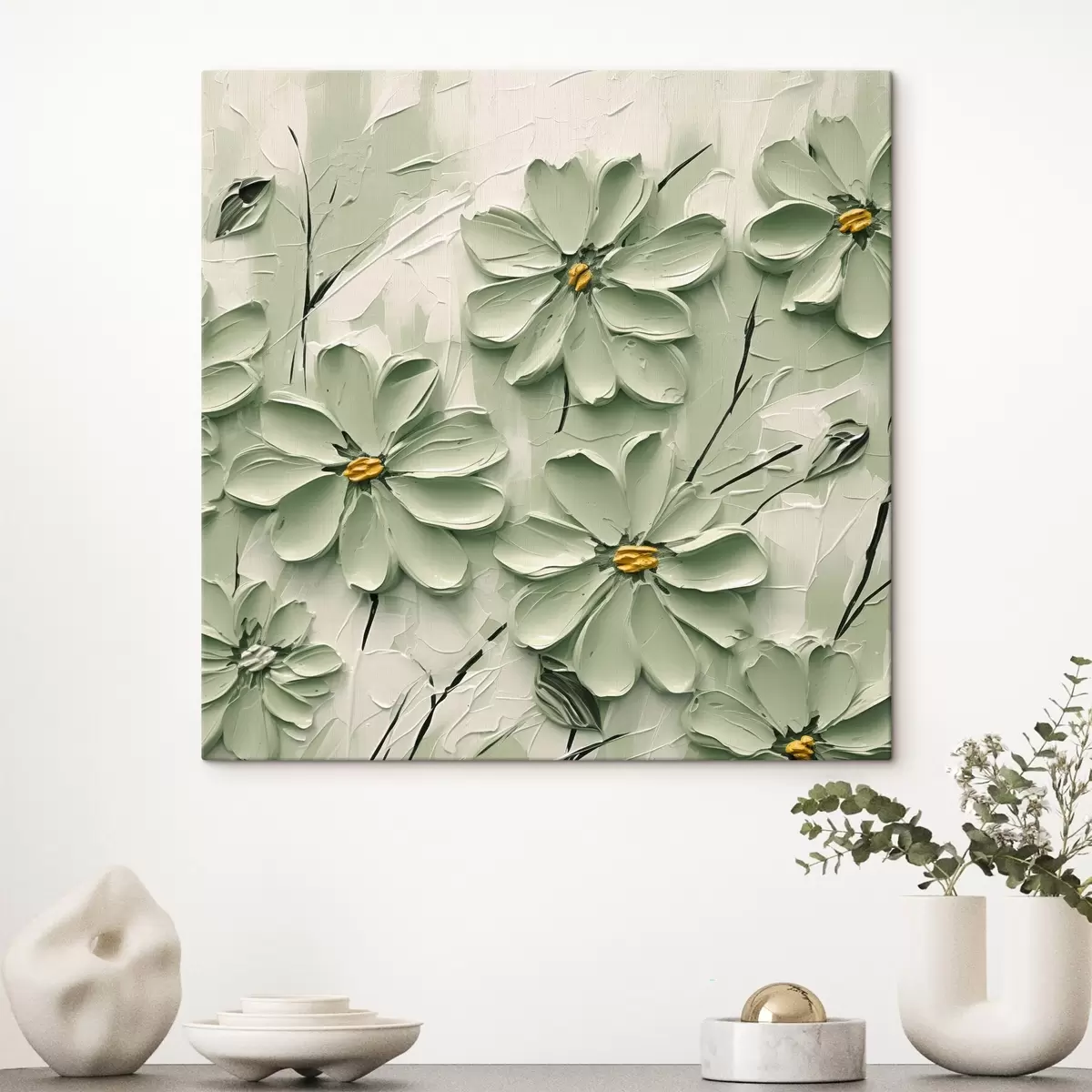 Schilderij Groene bloemen met gele harten geschilderd in dikke penseelstreken op een lichte achtergrond Art. s45265