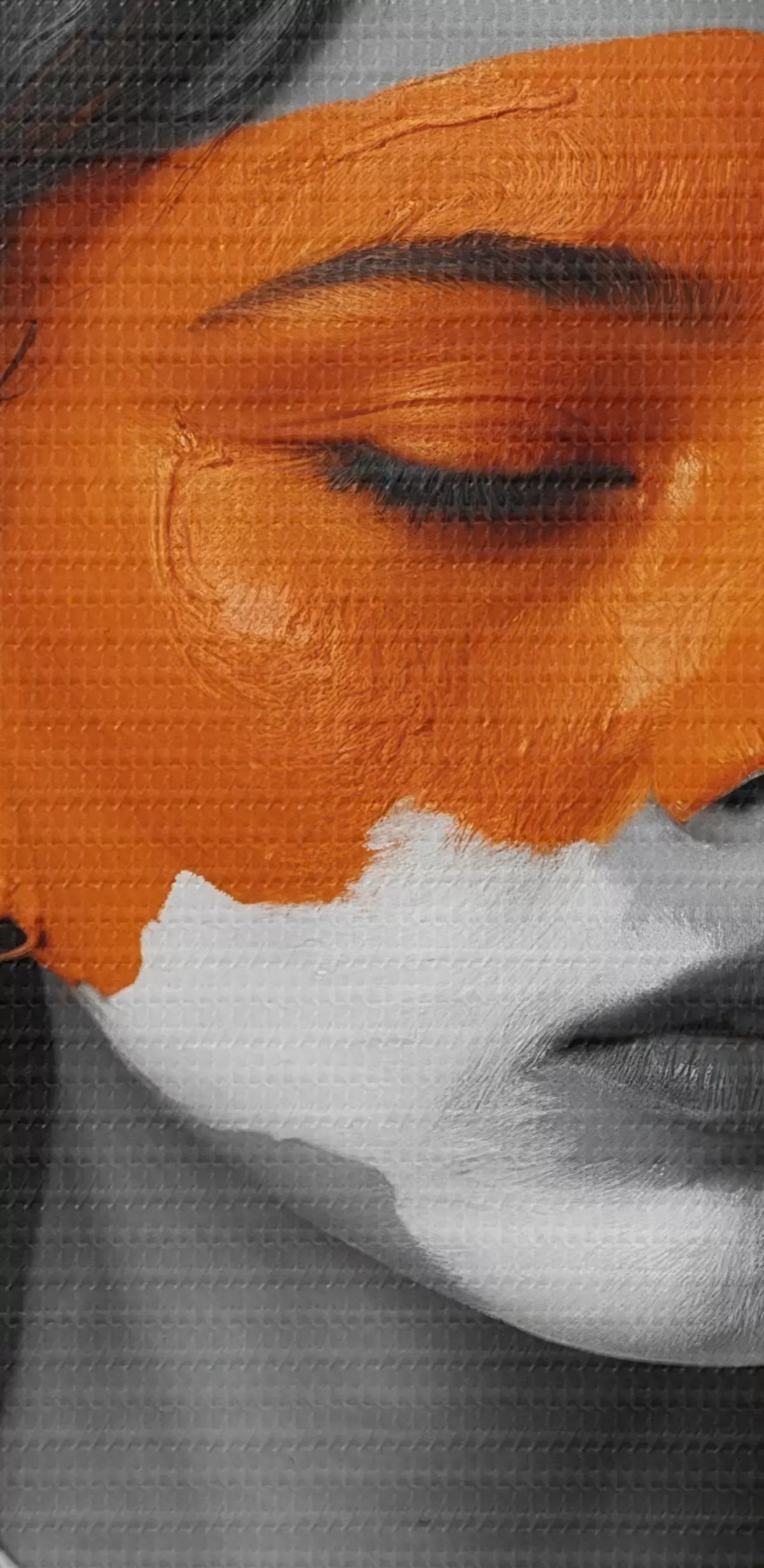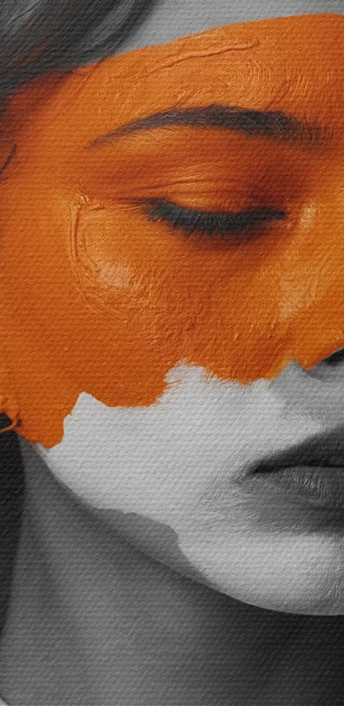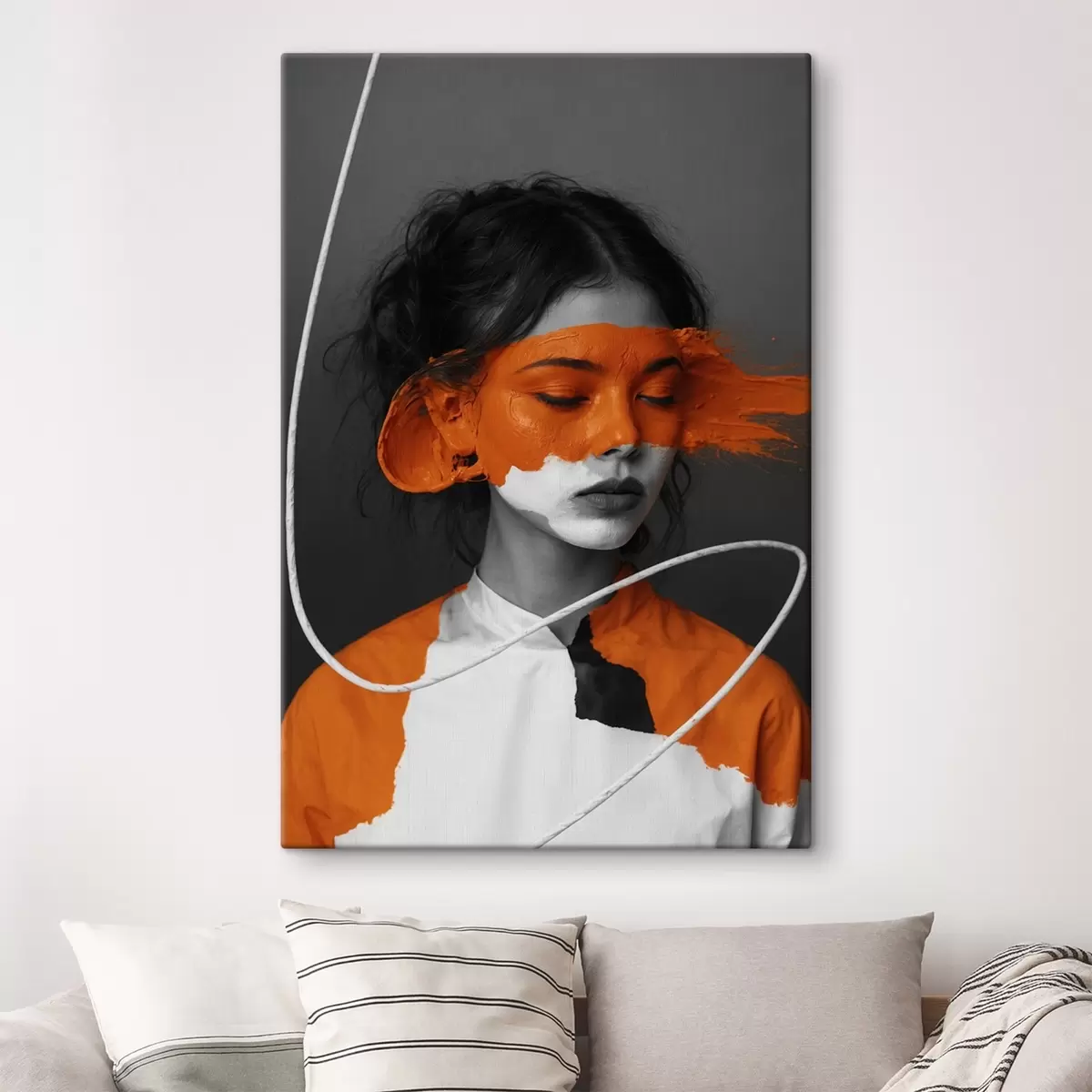 Schilderij Portret van een meisje met een abstracte oranje afbeelding Art. s45495