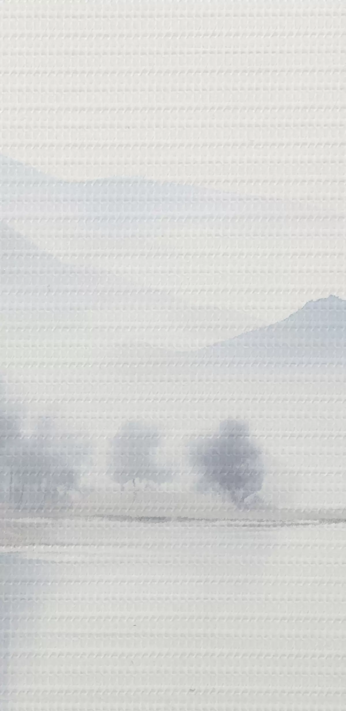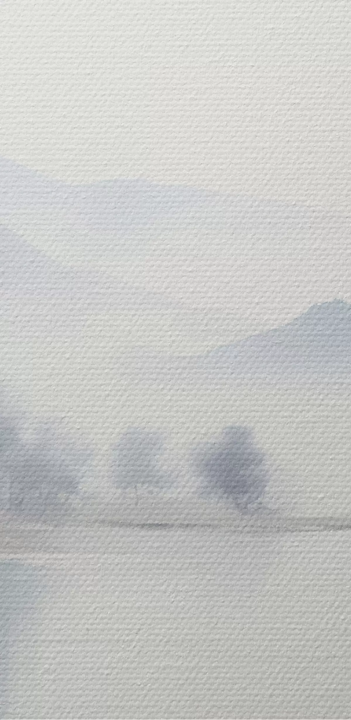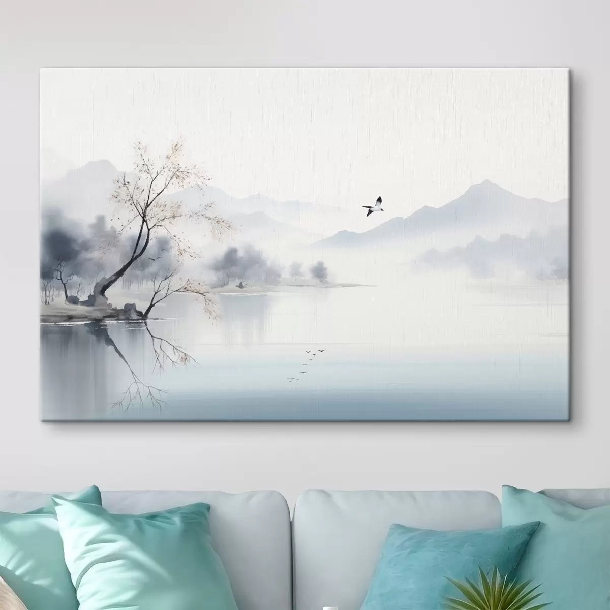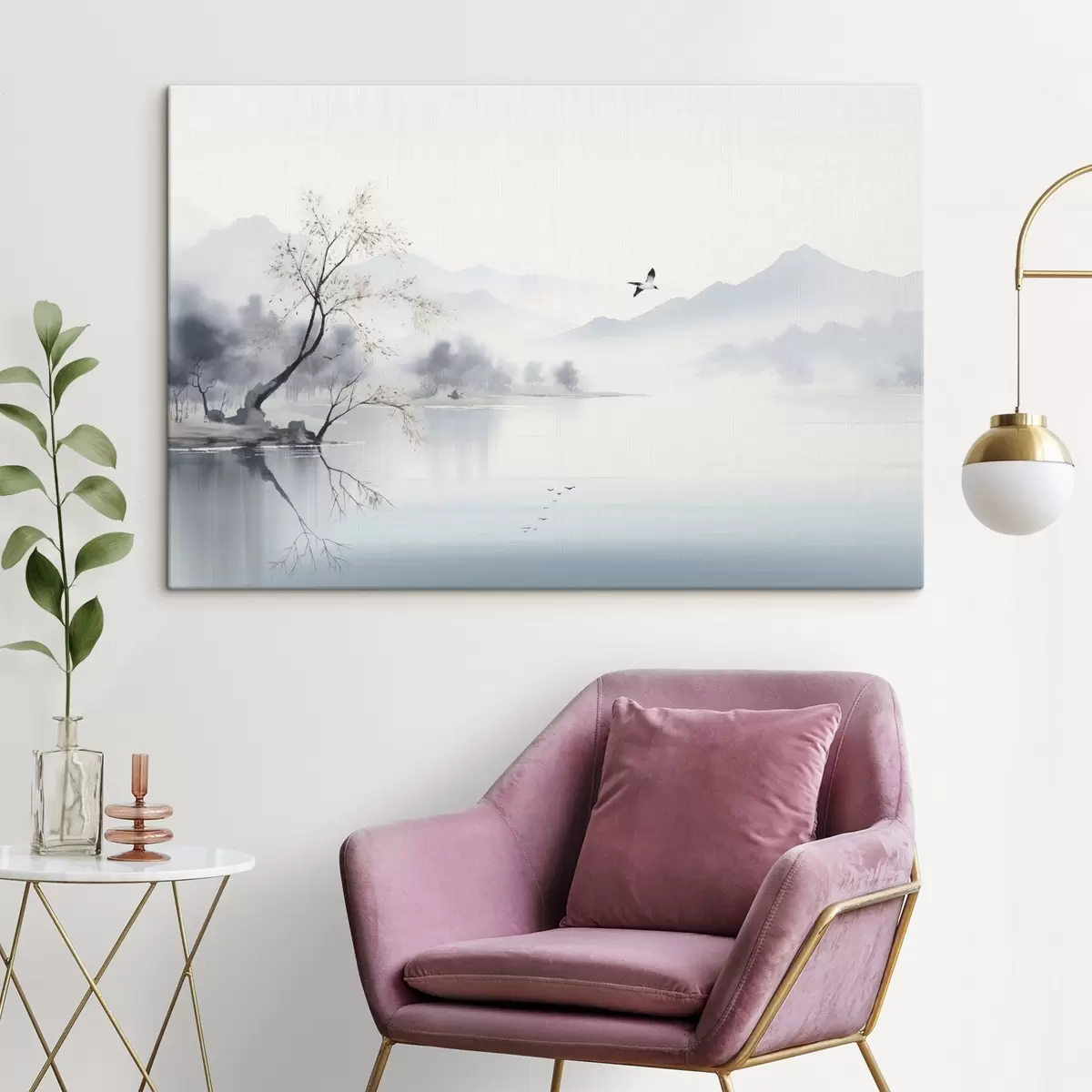 Schilderij Mistig landschap met een boom, bergen en vogels Art. s45518