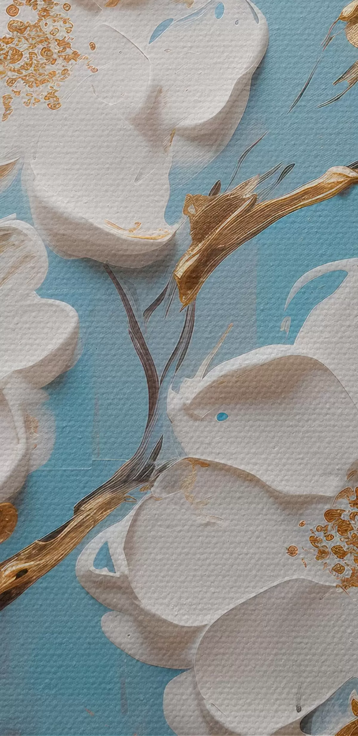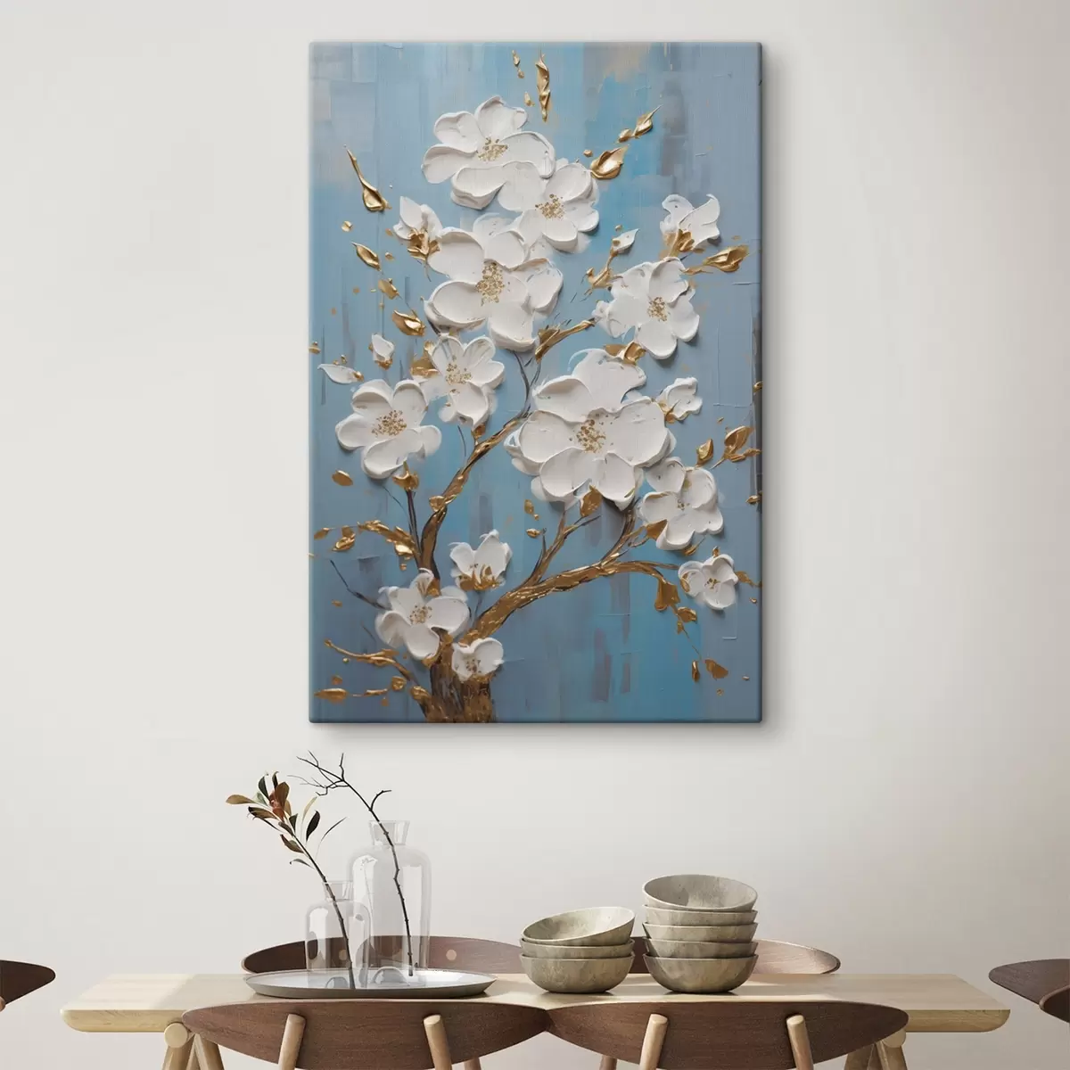 Schilderij Witte bloemen op een tak: decoratief motief in lichtblauwe tinten Art. s45541