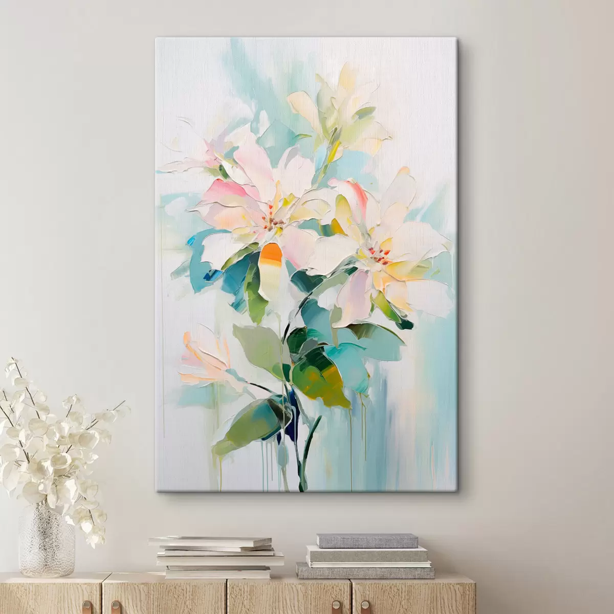 Schilderijen Bloemen met kleurrijke accenten, groene bladeren, zachte penseelstreken olieverf imitatie, lichtblauwe achtergrond s45549