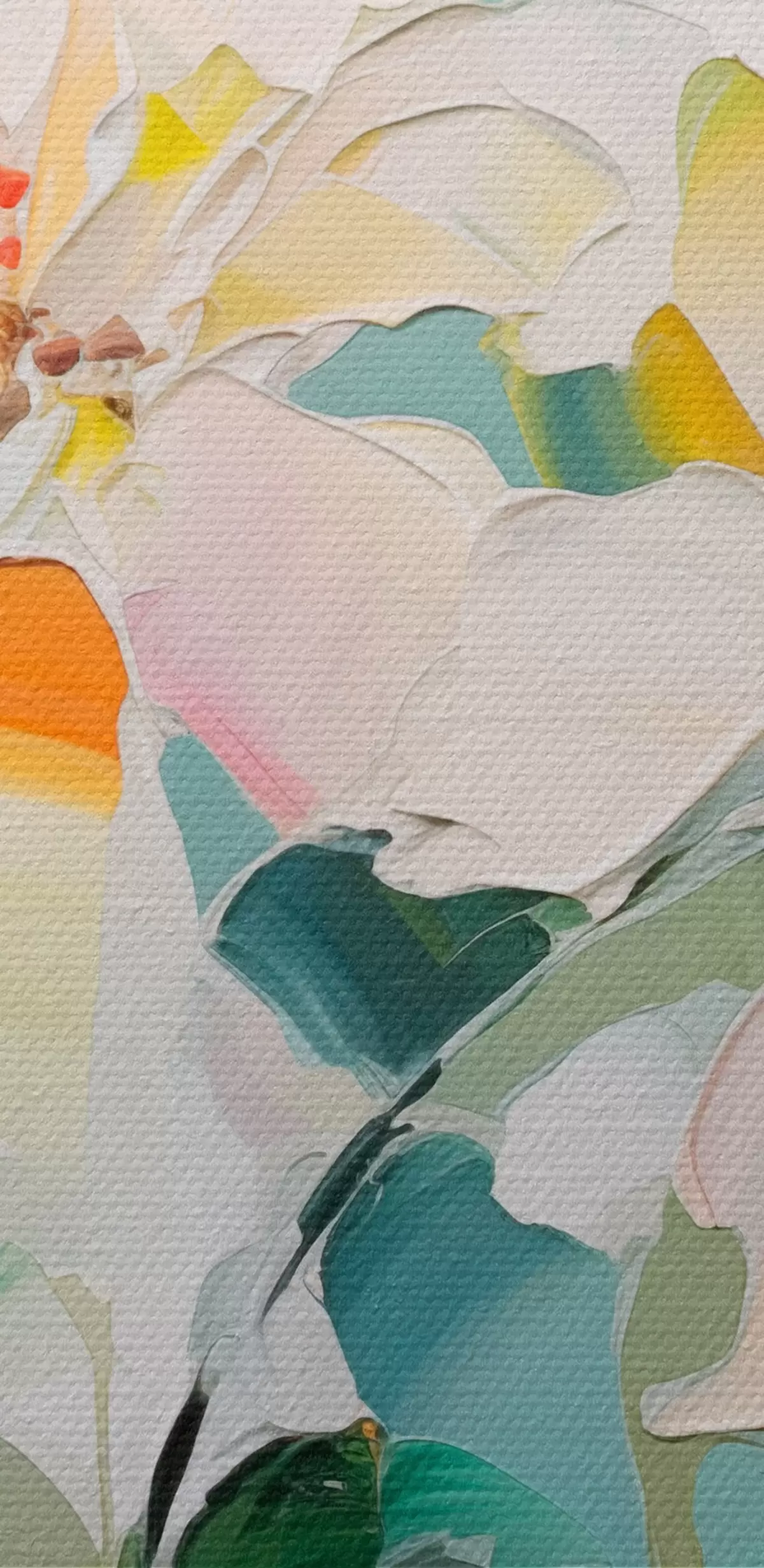 Schilderij Bloemen met kleurrijke accenten, groene bladeren, zachte penseelstreken olieverf imitatie, lichtblauwe achtergrond Art. s45549