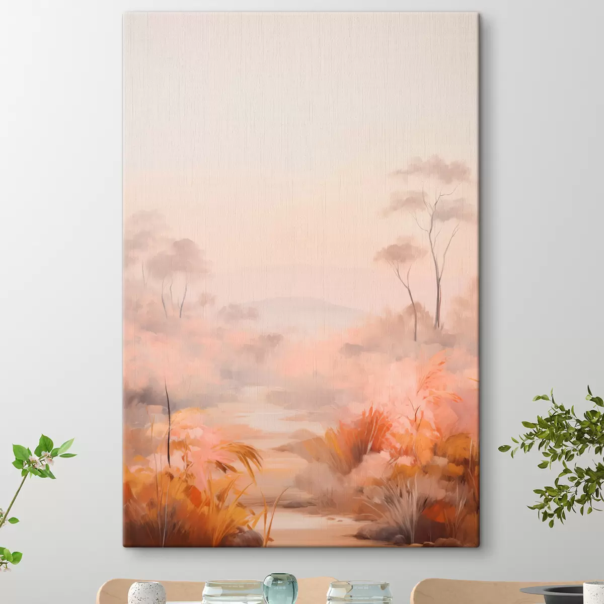 Schilderij Een landschap met struiken en bomen in roze, oranje en bruine tinten, met bergen op de achtergrond Art. s45553