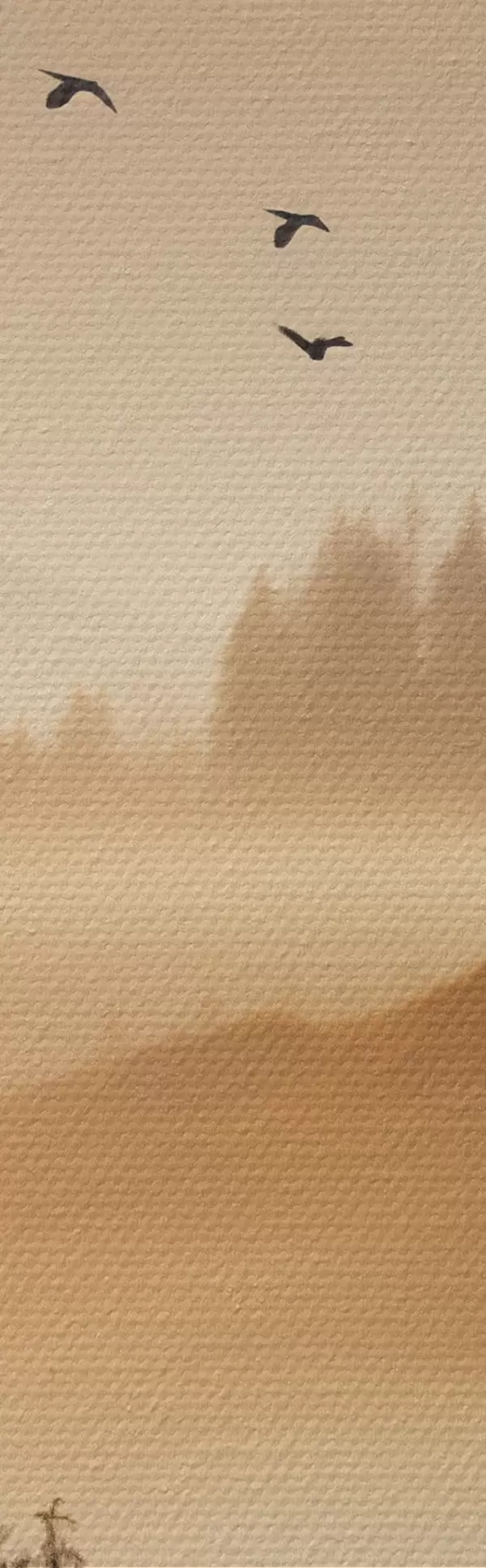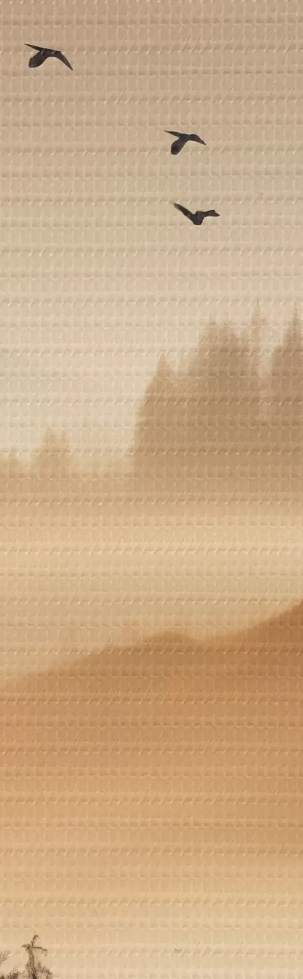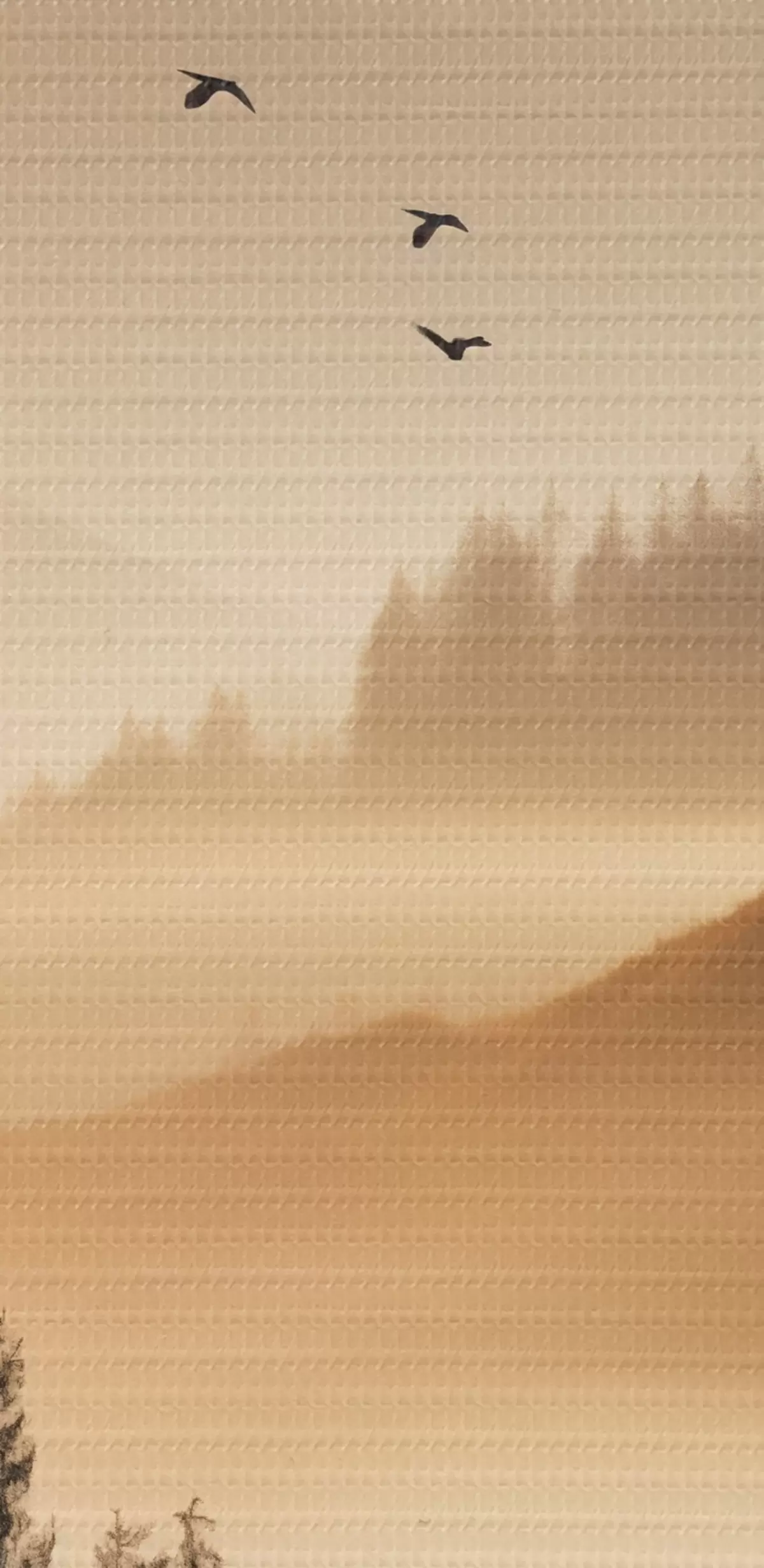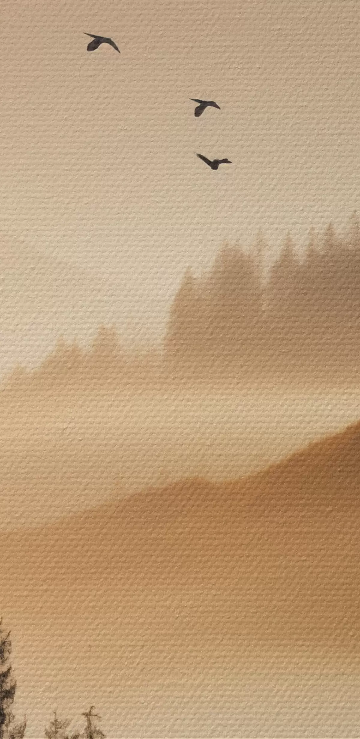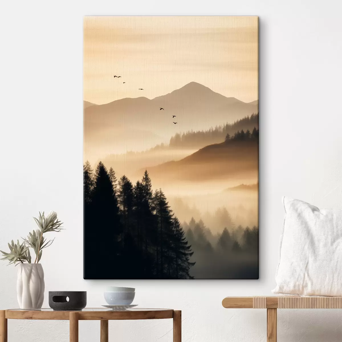 Schilderij Een berglandschap met een bos en vogels die in de lucht vliegen, alles bedekt met een dikke laag mist tijdens zonsopgang Art. s45563
