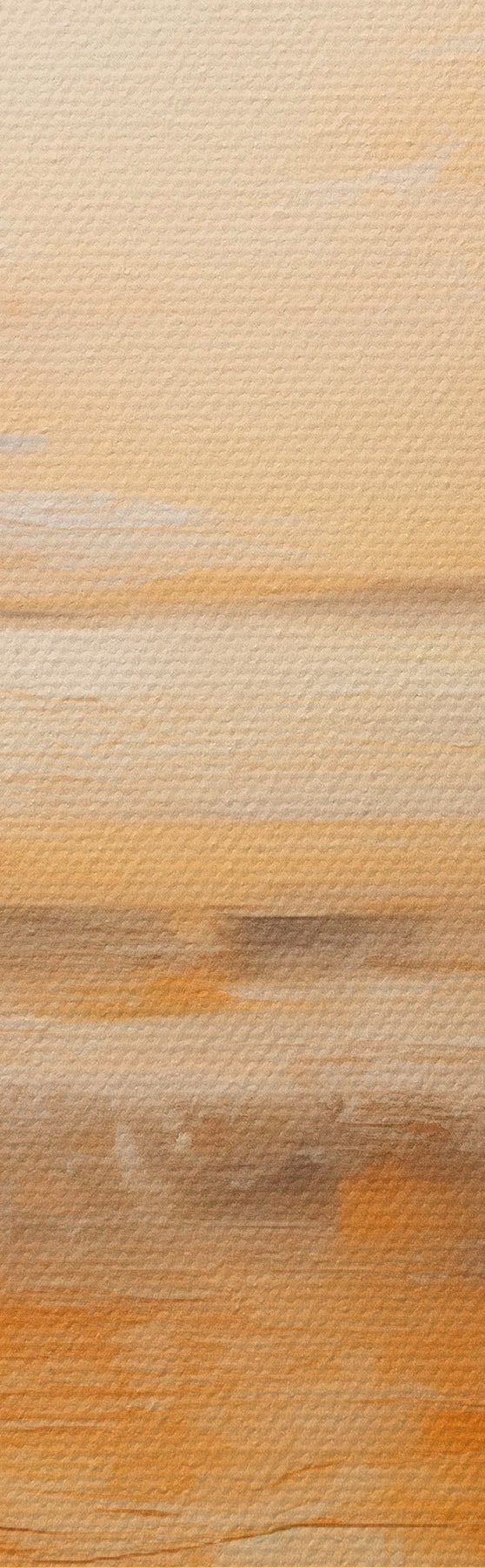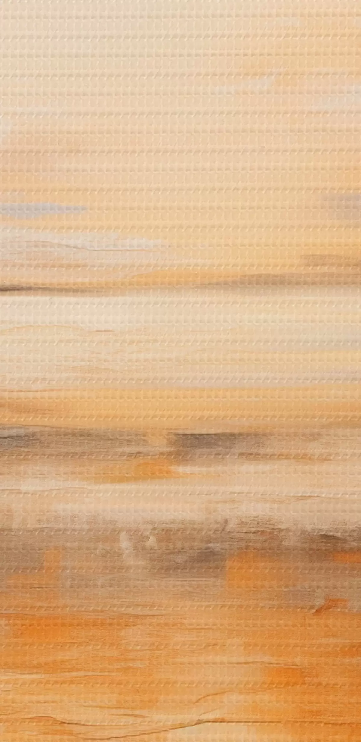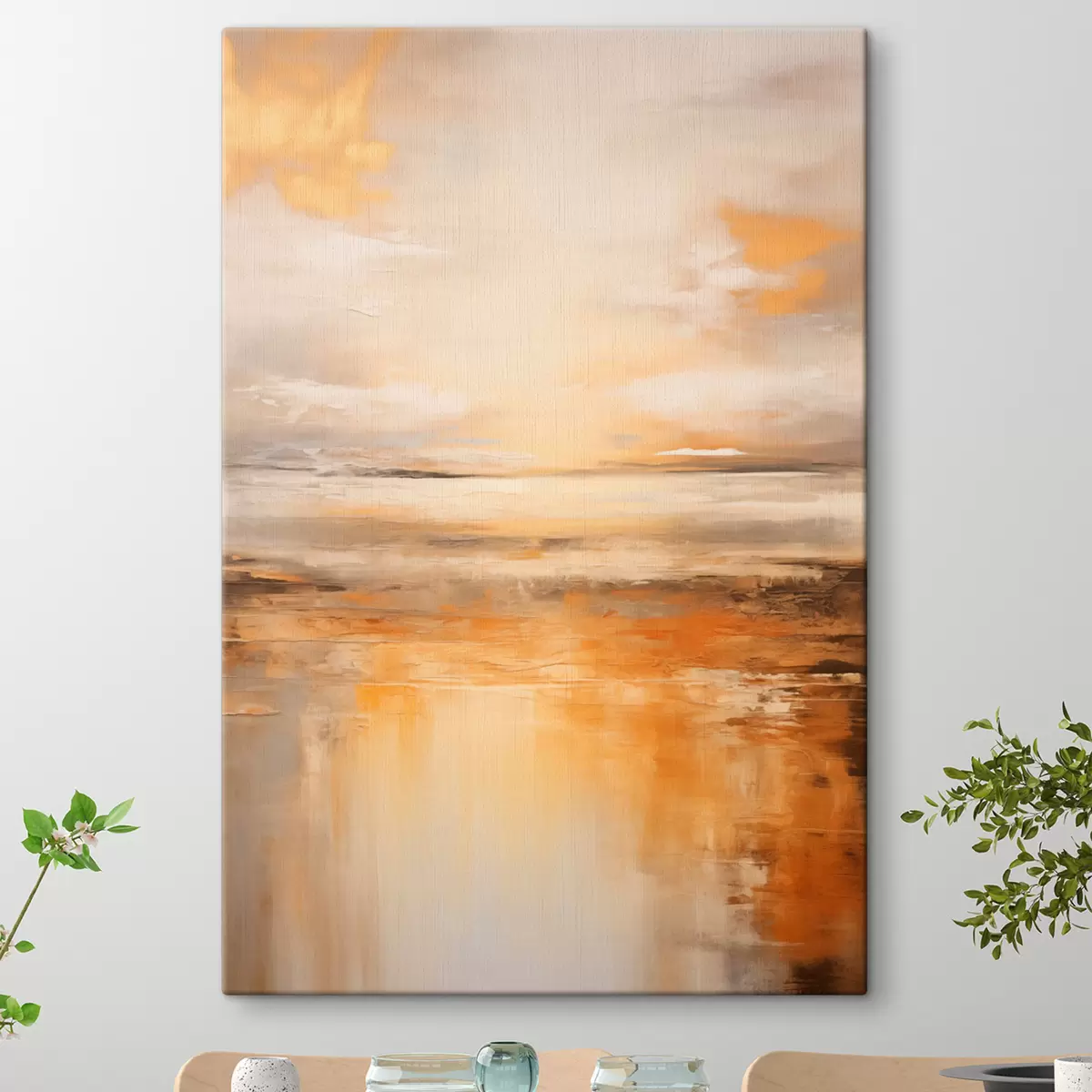 Schilderij Een abstract schilderij van een strandlandschap met een kalme oceaan, oranje zand en een bewolkte lucht met zon Art. s45567