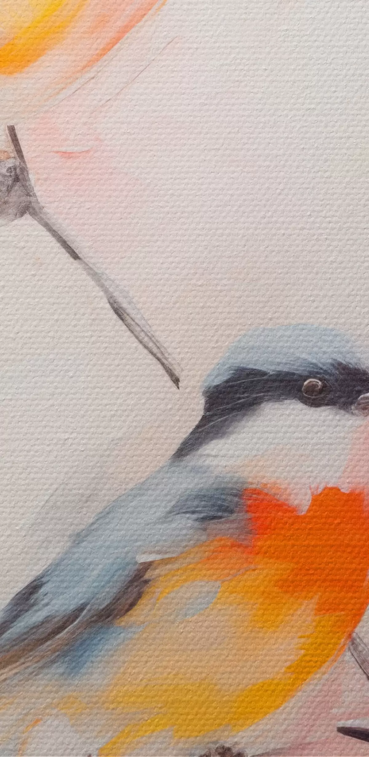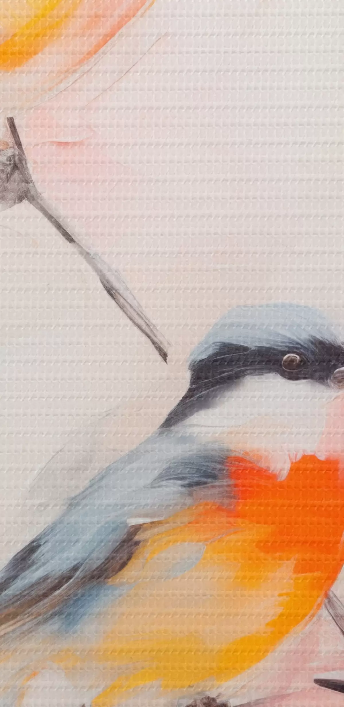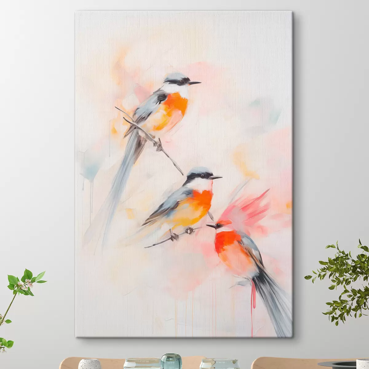 Schilderij Vogels neergestreken op takken , zachte pastelkleuren, lichte achtergrond met roze en witte tinten Art. s45577