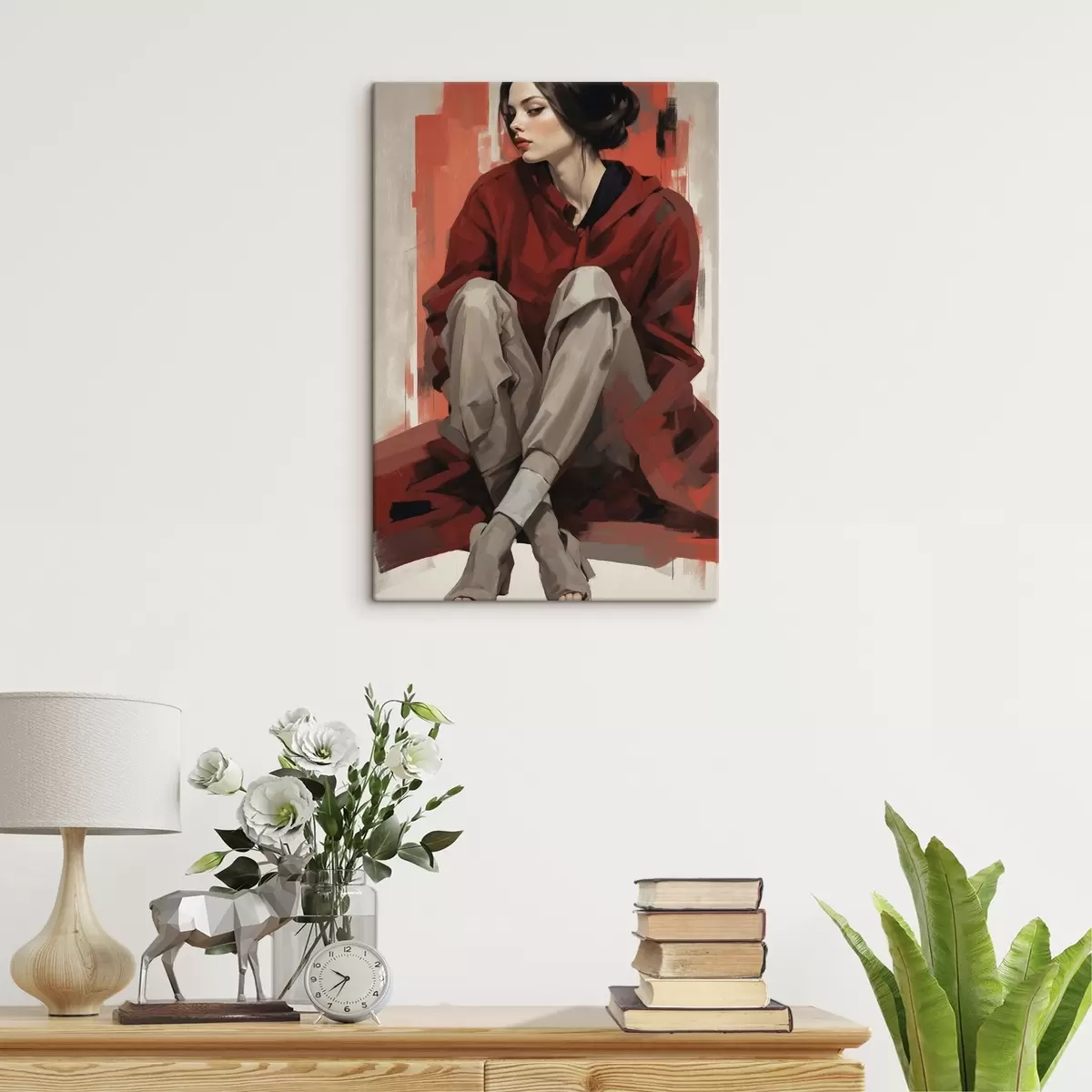 Schilderij Meisje in een rode mantel zittend met gevouwen benen Art. s45624