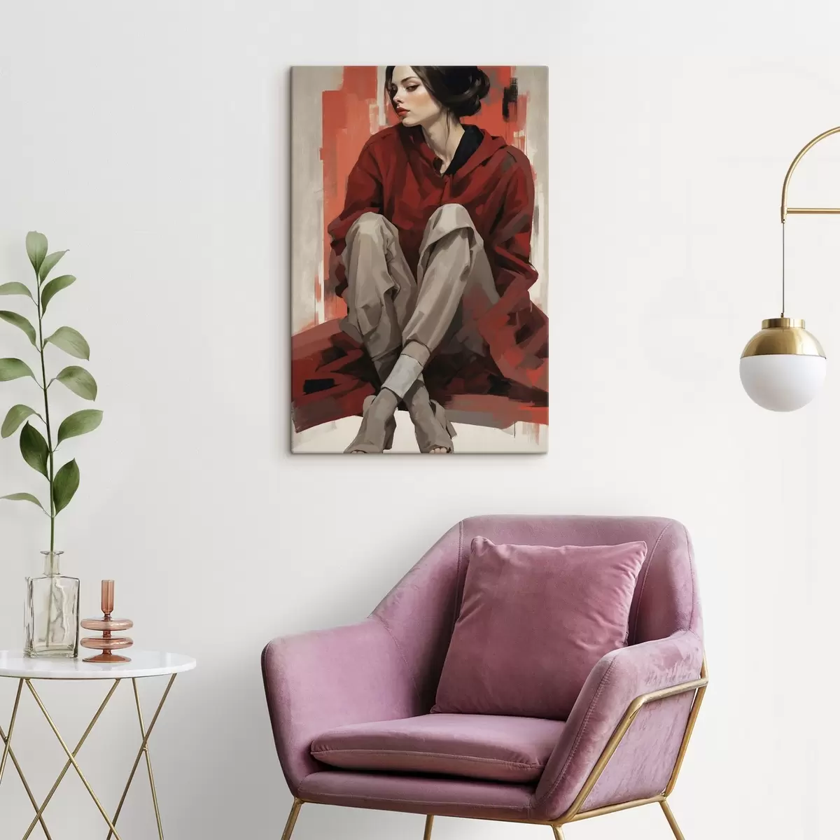 Schilderijen Meisje in een rode mantel zittend met gevouwen benen s45624