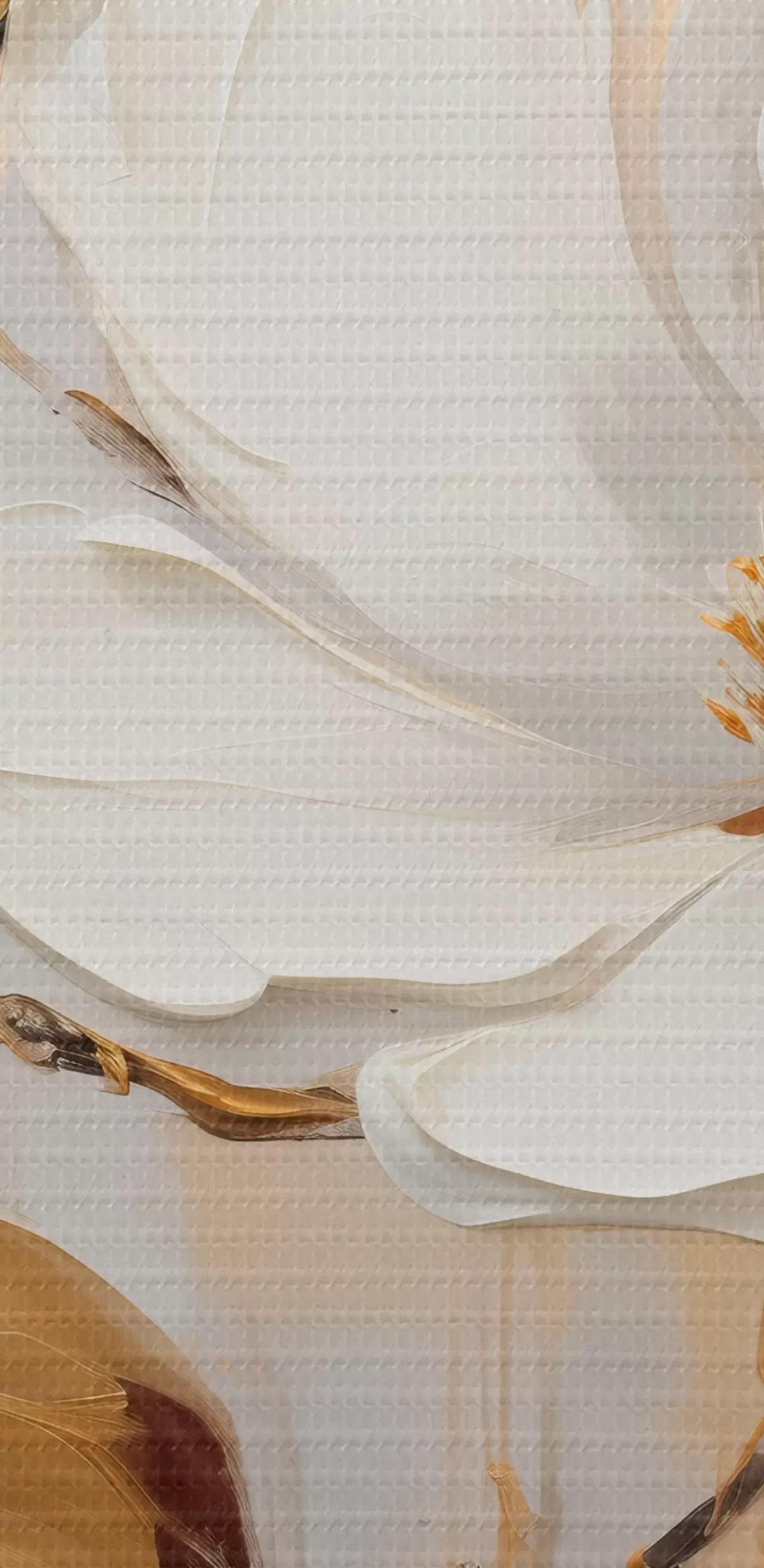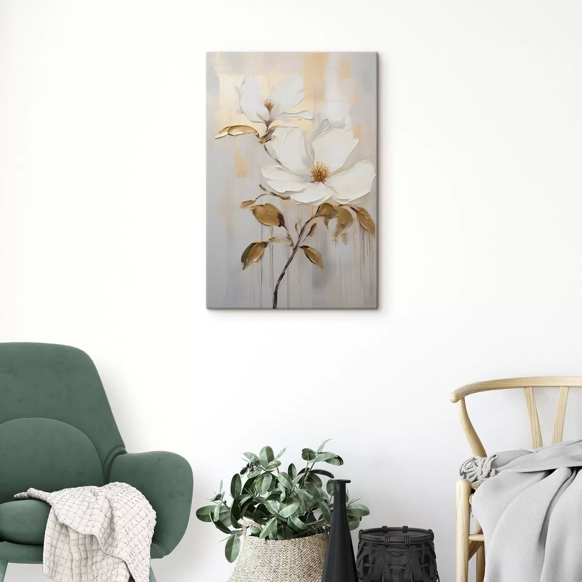 Schilderij Twee witte bloemen met geeloranje bladeren op een lichte achtergrond Art. s45691