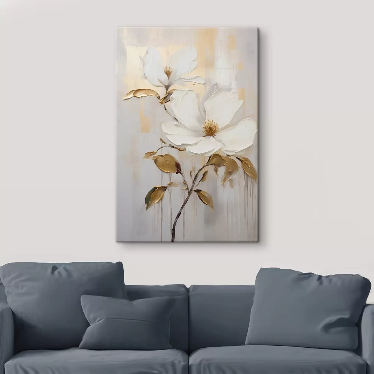 Schilderijen Twee witte bloemen met geeloranje bladeren op een lichte achtergrond s45691