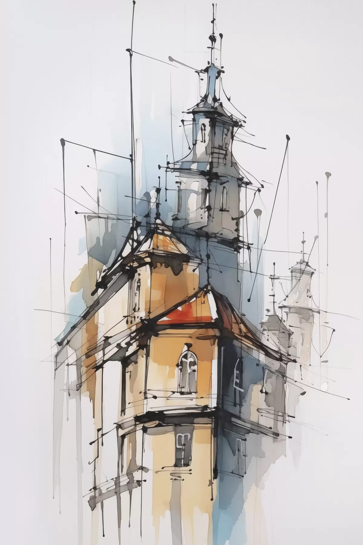 Schilderijen Huizen imitatie schets en aquarel s45765