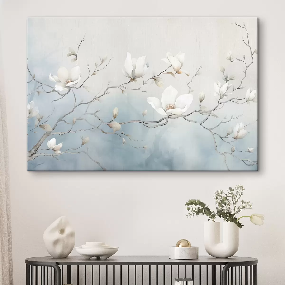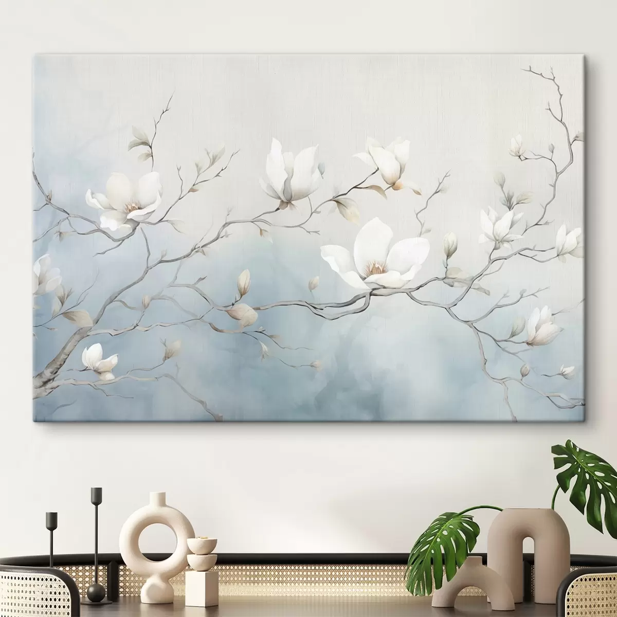 Schilderijen Magnoliatakken met witte bloemen op een delicate achtergrond s45806