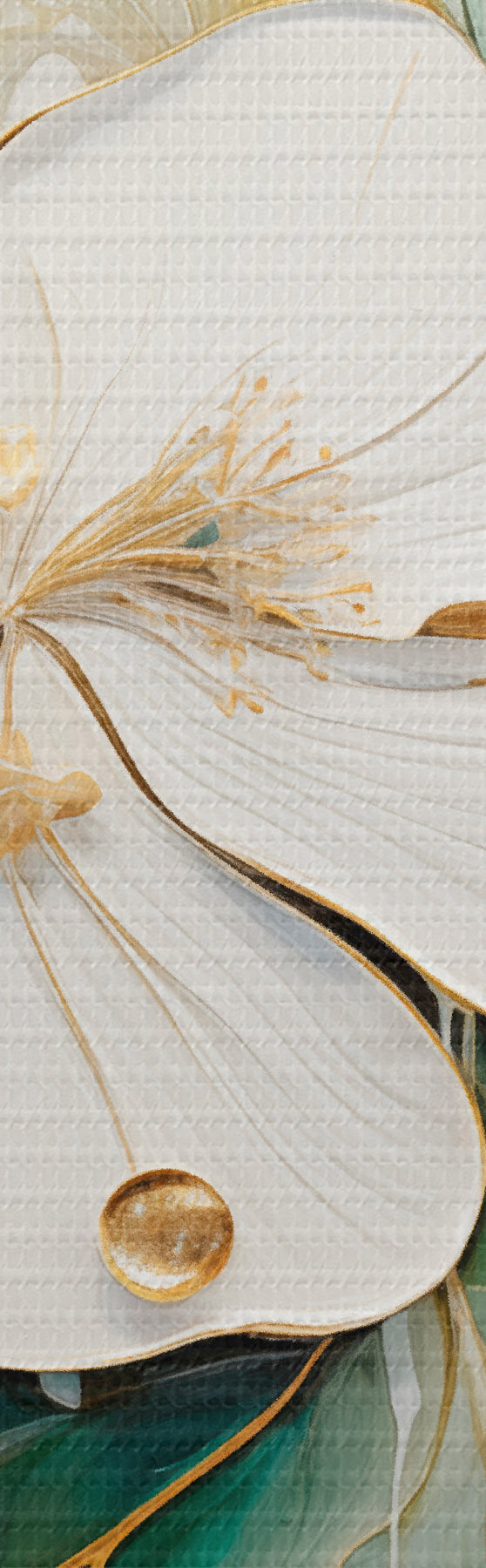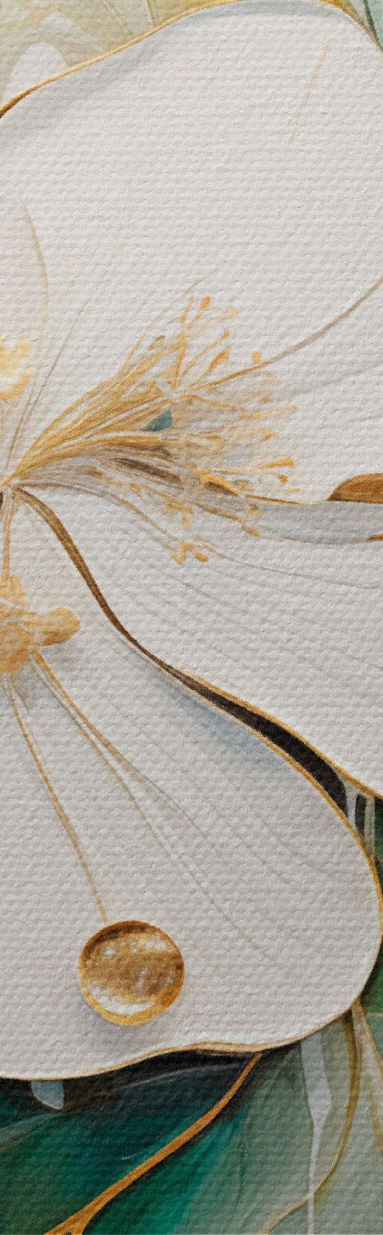 Schilderij Een witte bloem met geeloranje details en groene bladeren Art. s45815
