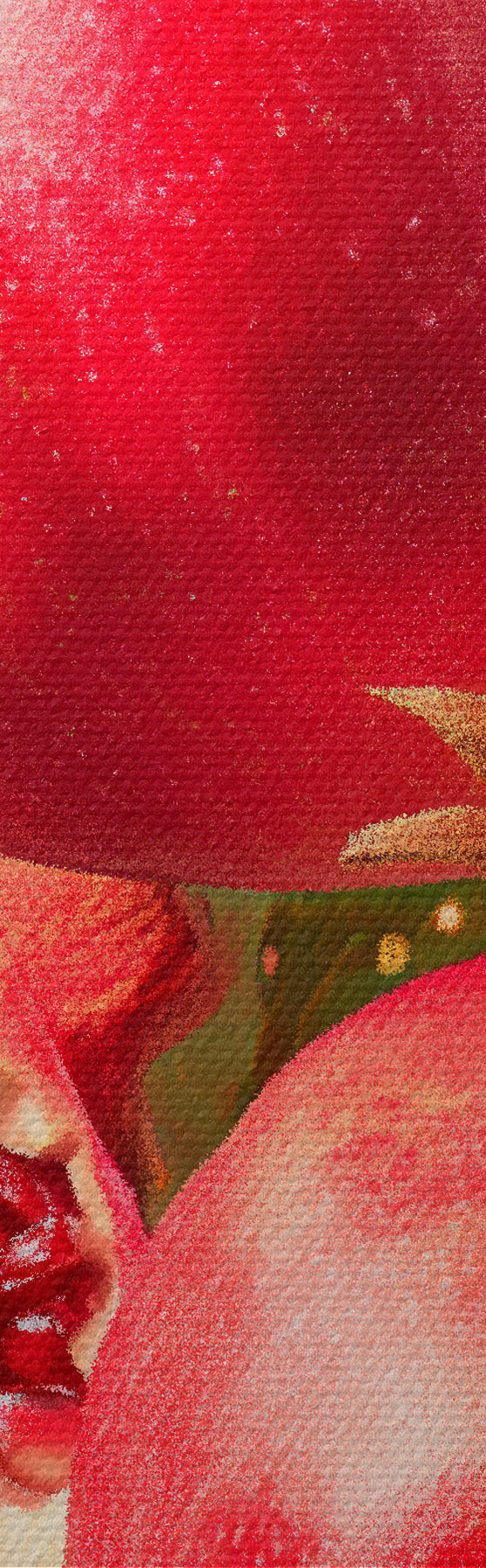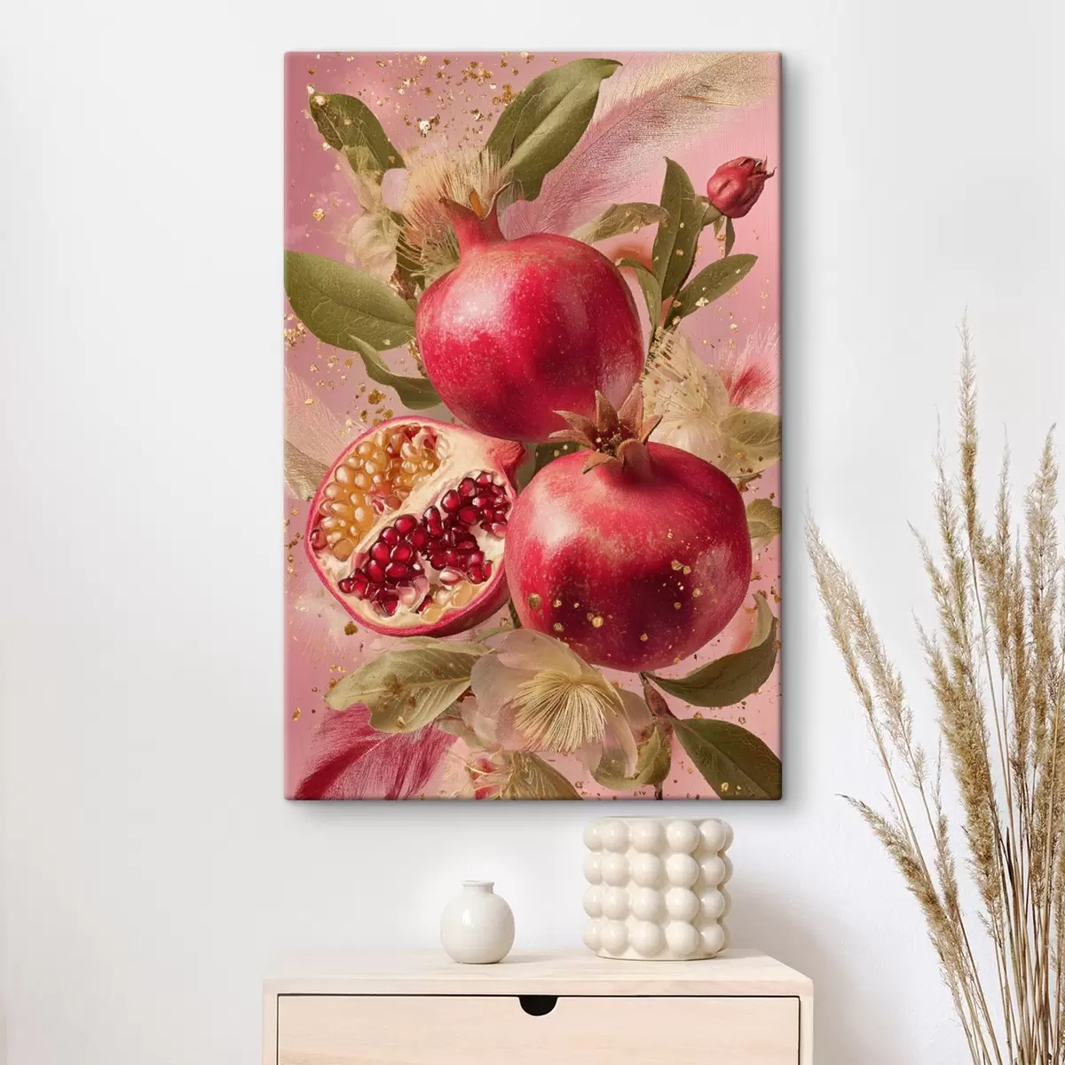Schilderij Rijpe granaatappels op een roze achtergrond met bladeren en vlekjes Art. s45868