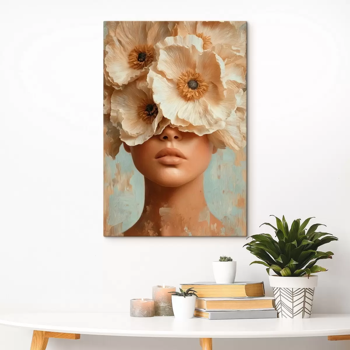 Schilderij Portret met beige bloemen die de ogen bedekken Art. s45870