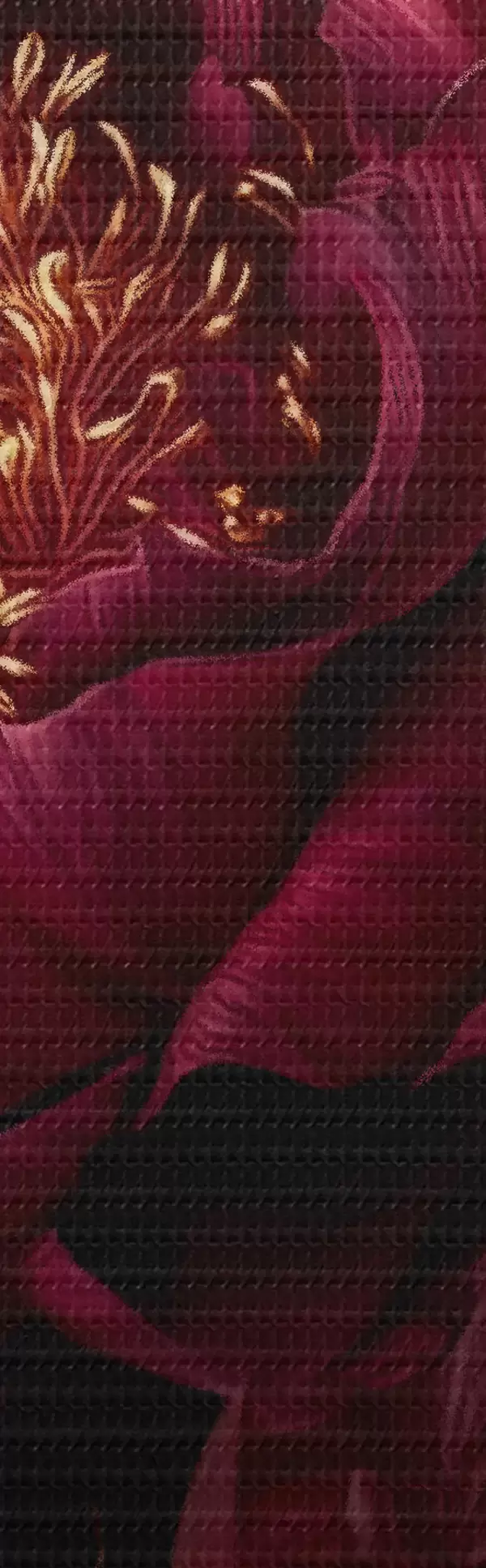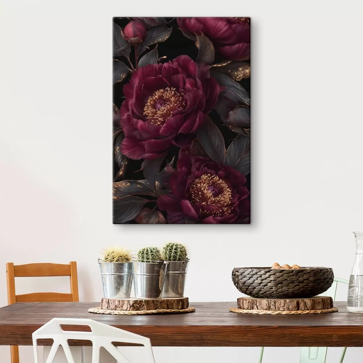 Schilderij Bordeauxrode pioenrozen op zwart met gele accenten Art. s45877