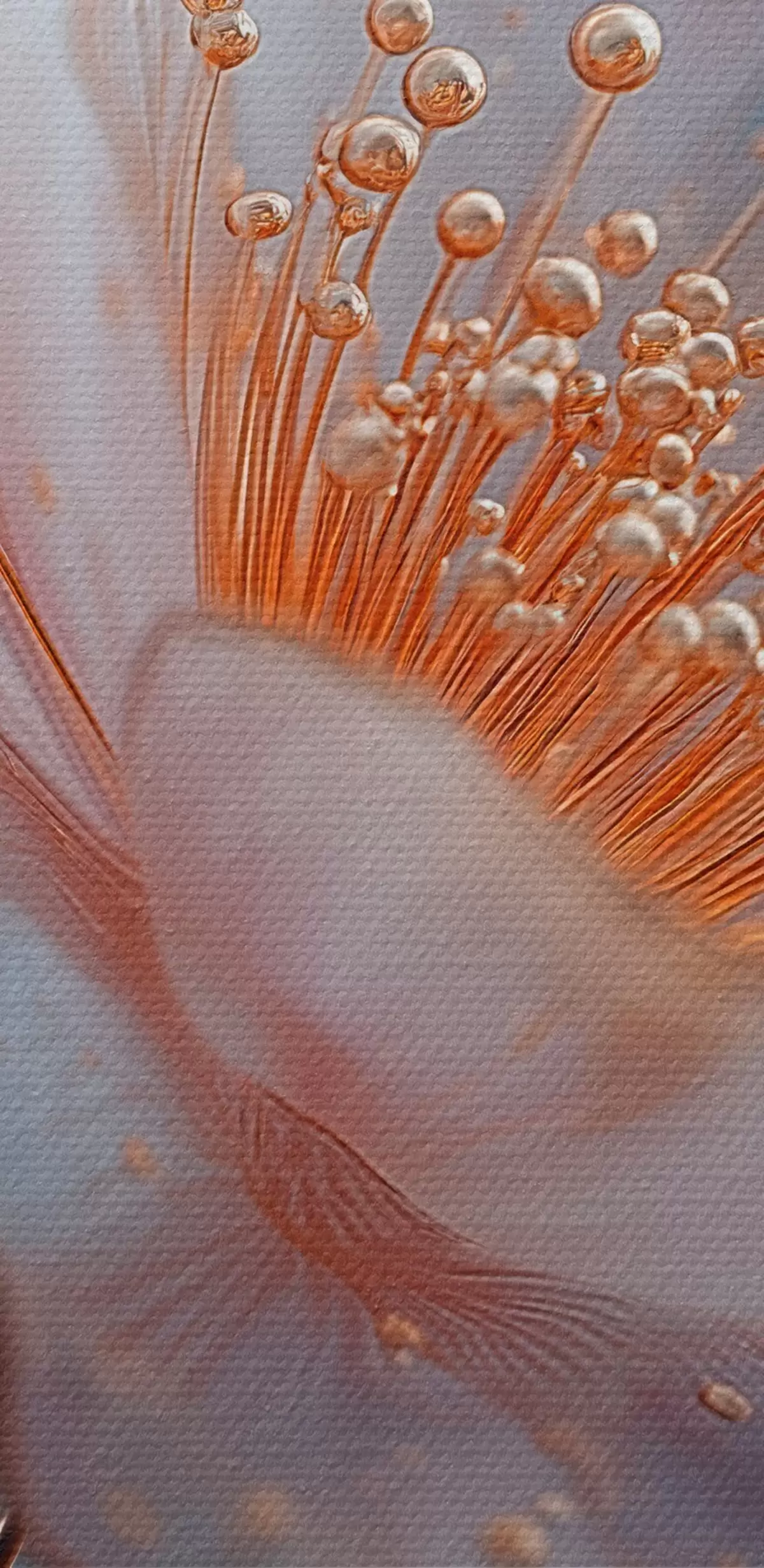 Schilderij Doorschijnende bloem met koperen meeldraden op blauw Art. s45880