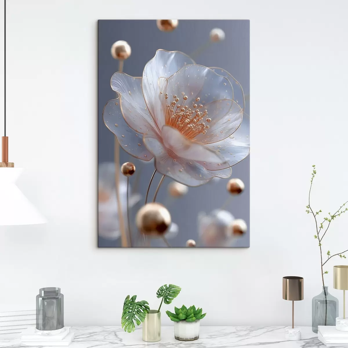 Schilderij Doorschijnende bloem met koperen meeldraden op blauw Art. s45880