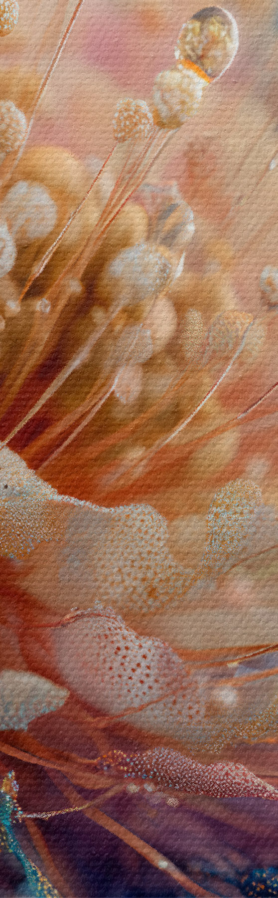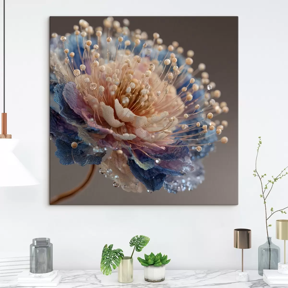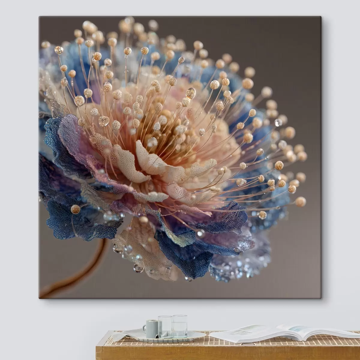 Schilderij Parelmoerachtige bloem met dauwdruppels, perzikkleurige en blauwe bloemblaadjes Art. s45911