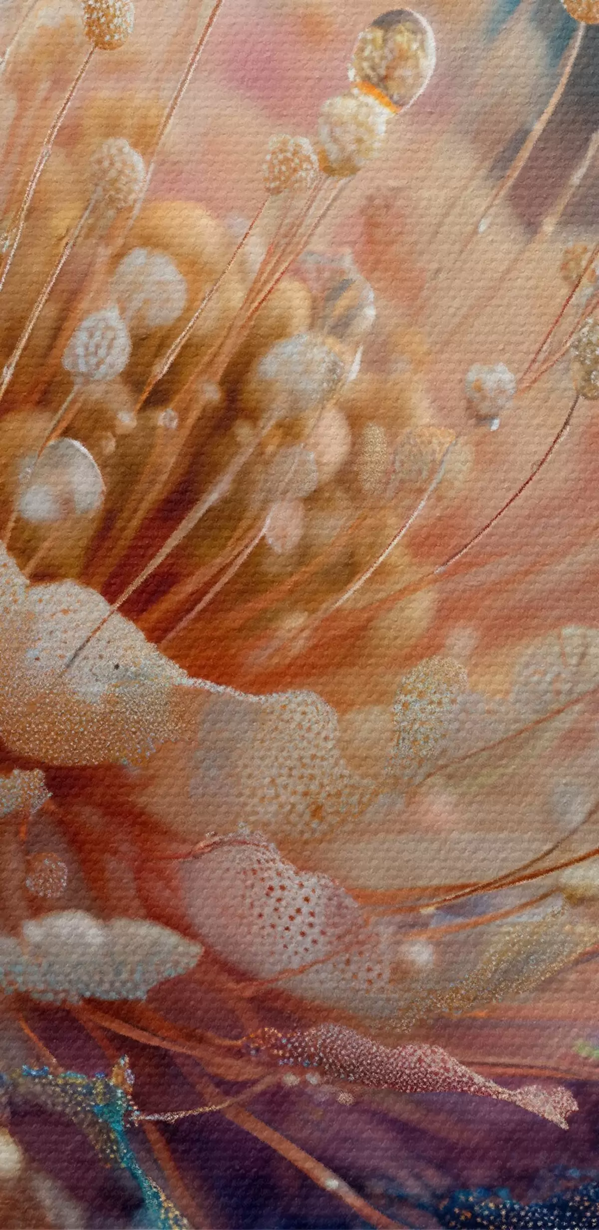 Schilderij Parelmoerachtige bloem met dauwdruppels, perzikkleurige en blauwe bloemblaadjes Art. s45911