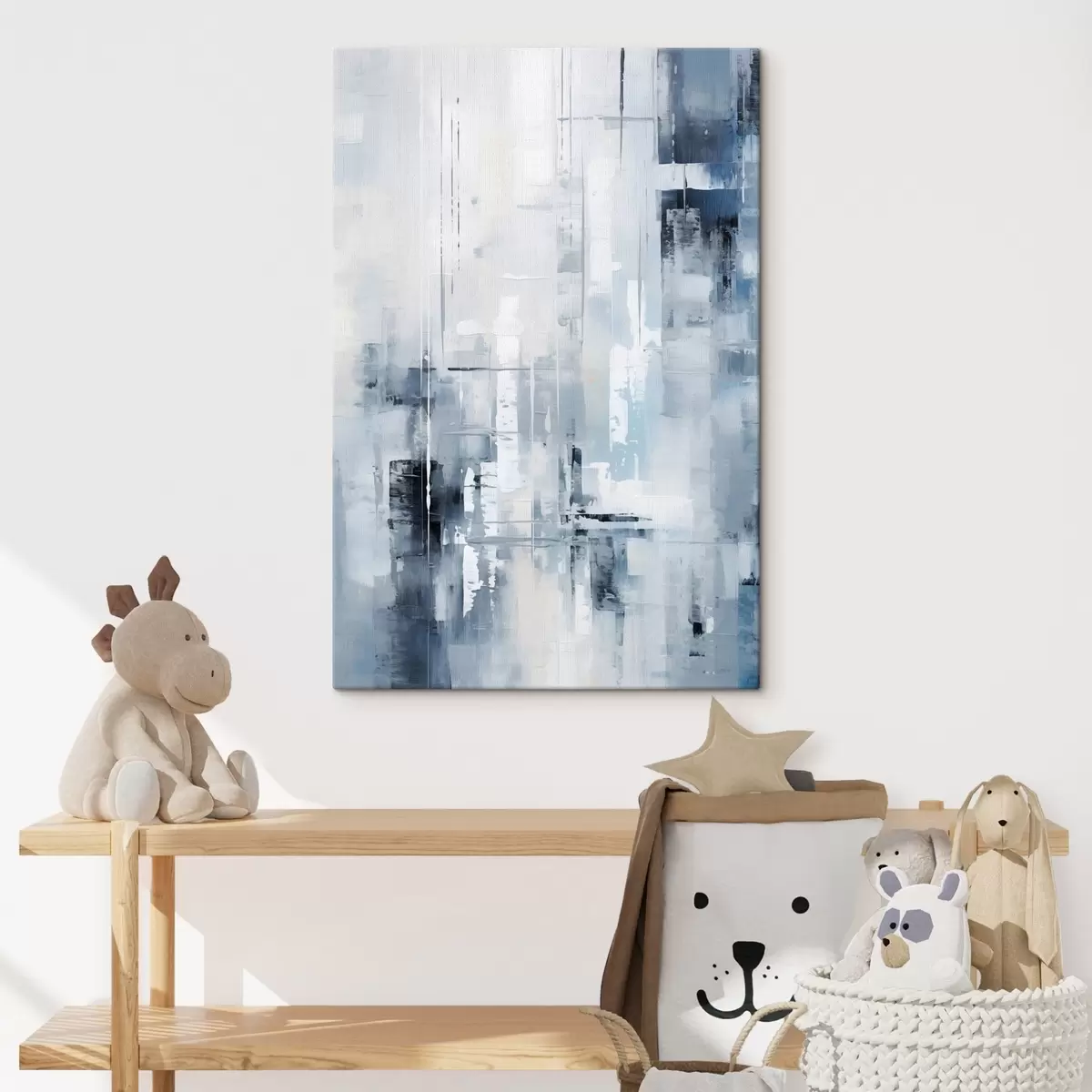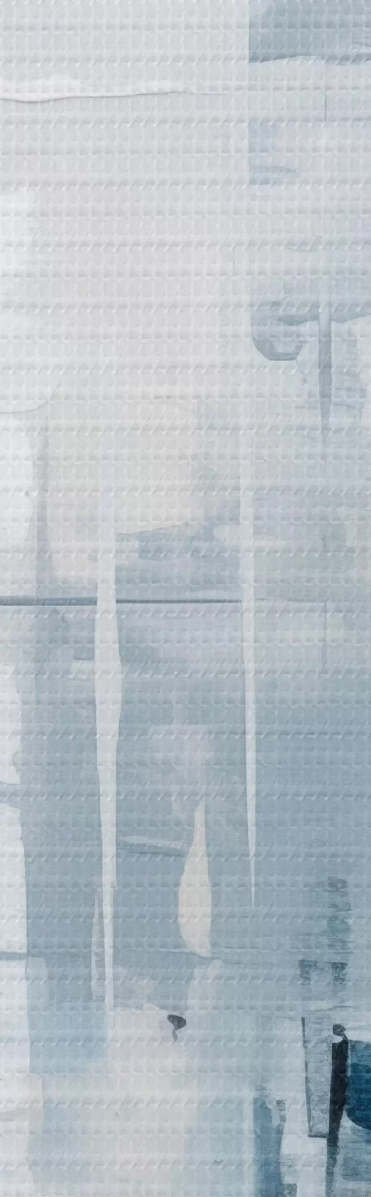Schilderij Abstracte schilderijimitatie met blauwe, grijze en witte kleuren, verticale lijnen en geometrische vormen Art. s45927