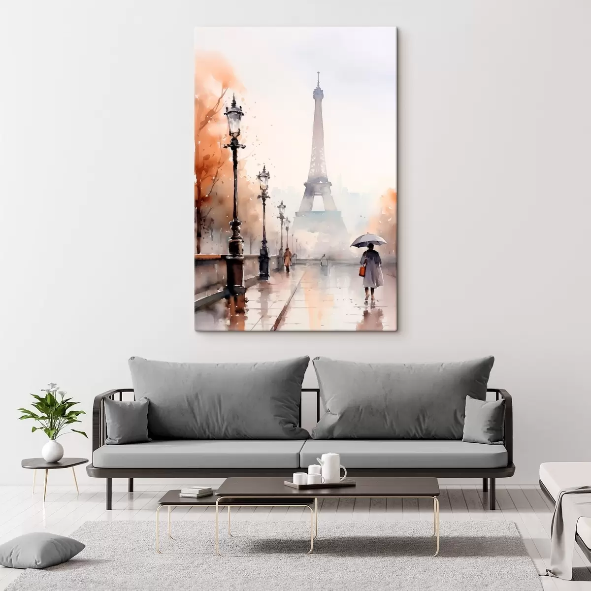 Schilderij Een regenachtige dag in Parijs met de Eiffeltoren op de achtergrond en vintage straatlantaarns Art. s45930