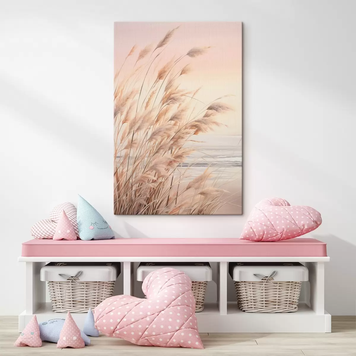 Schilderij Pampagras met pasteloranje kleurenpalet, lichtroze lucht, een rustig landschap Art. s45934
