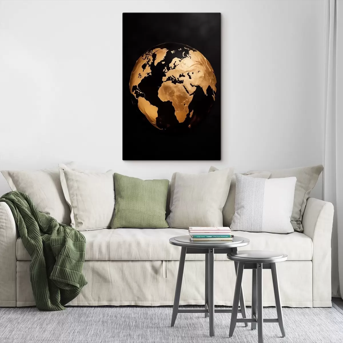 Schilderijen Gele gestructureerde abstracte wereldbol, planeet op een zwarte achtergrond, moderne minimalistische kunst s45942