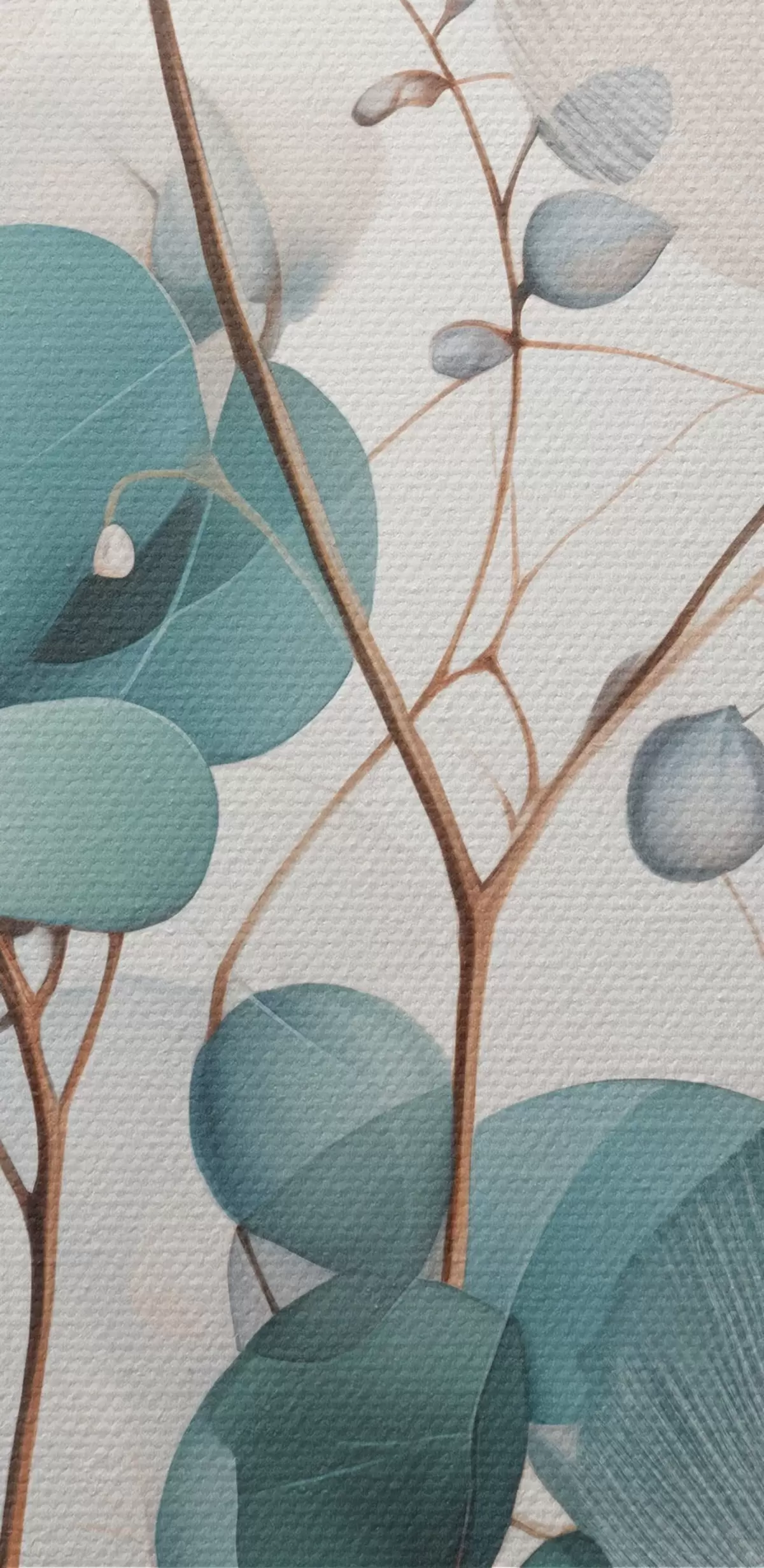 Schilderij Eucalyptus abstracte bloemen met witte bloemblaadjes, gedempte groene bladeren aan takken Art. s45946