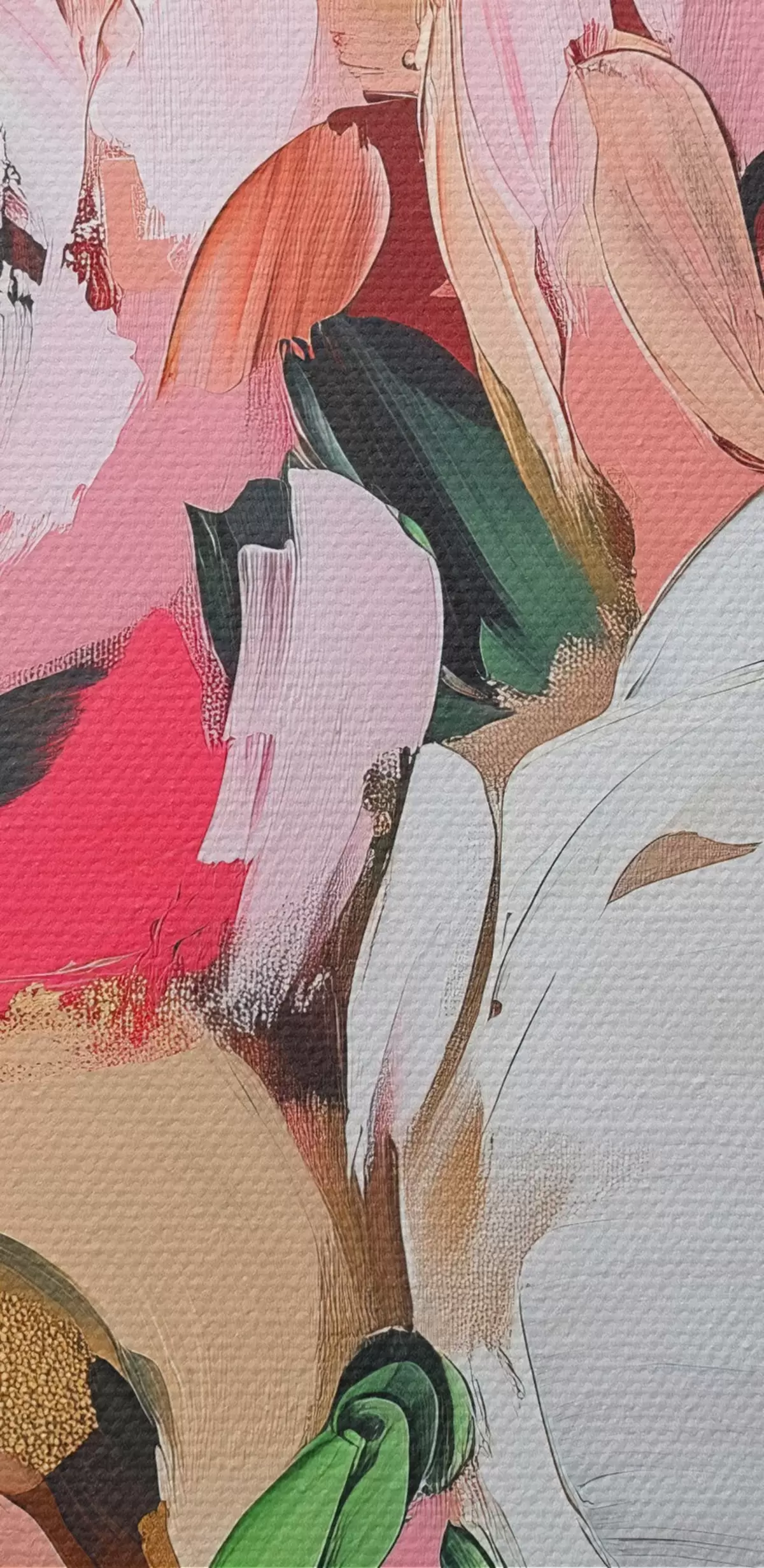 Het schilderij kan direct na ontvangst worden opgehangen. Het schilderij wordt opgespannen op een 2 cm breed houten spieraam.