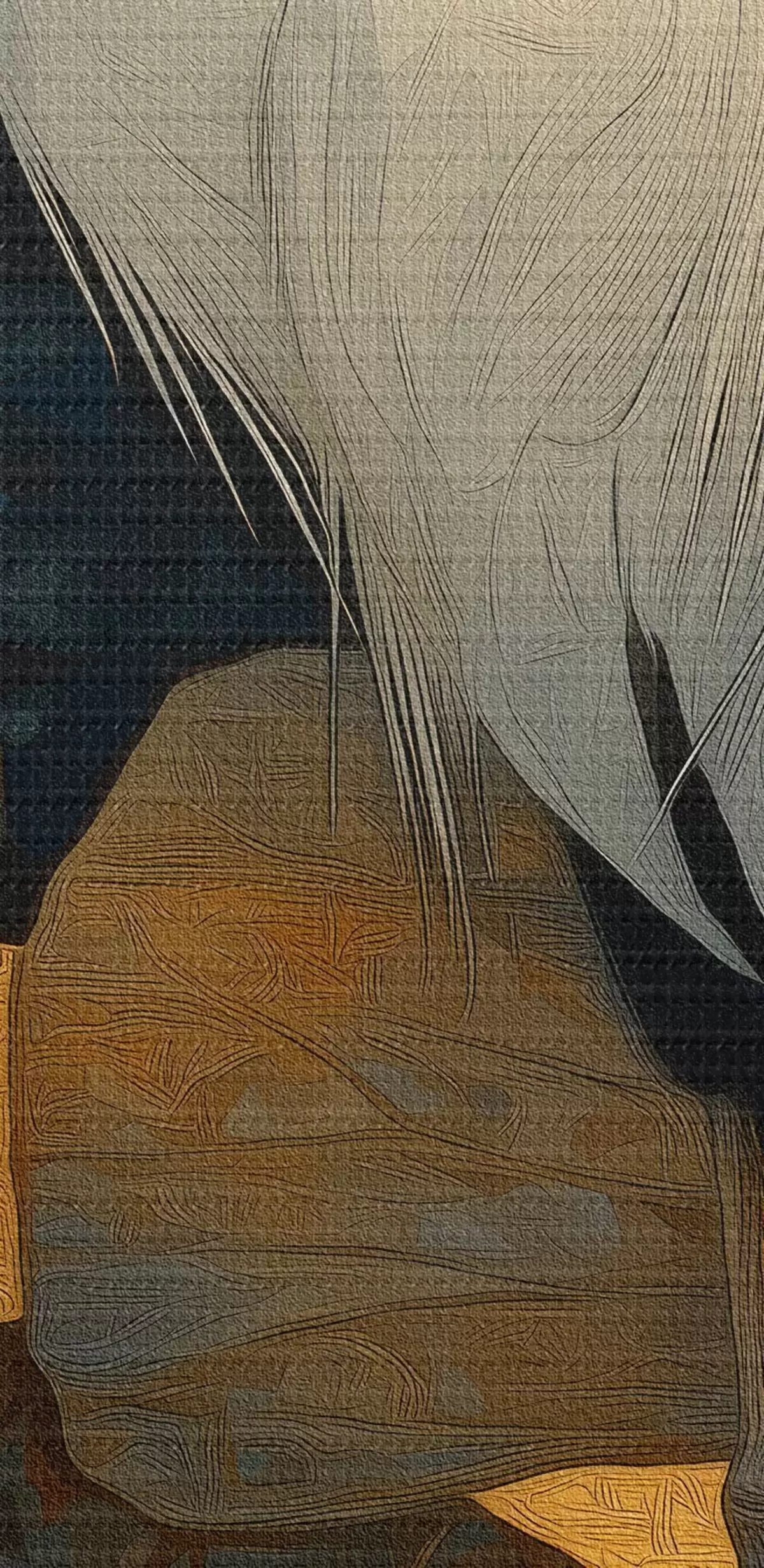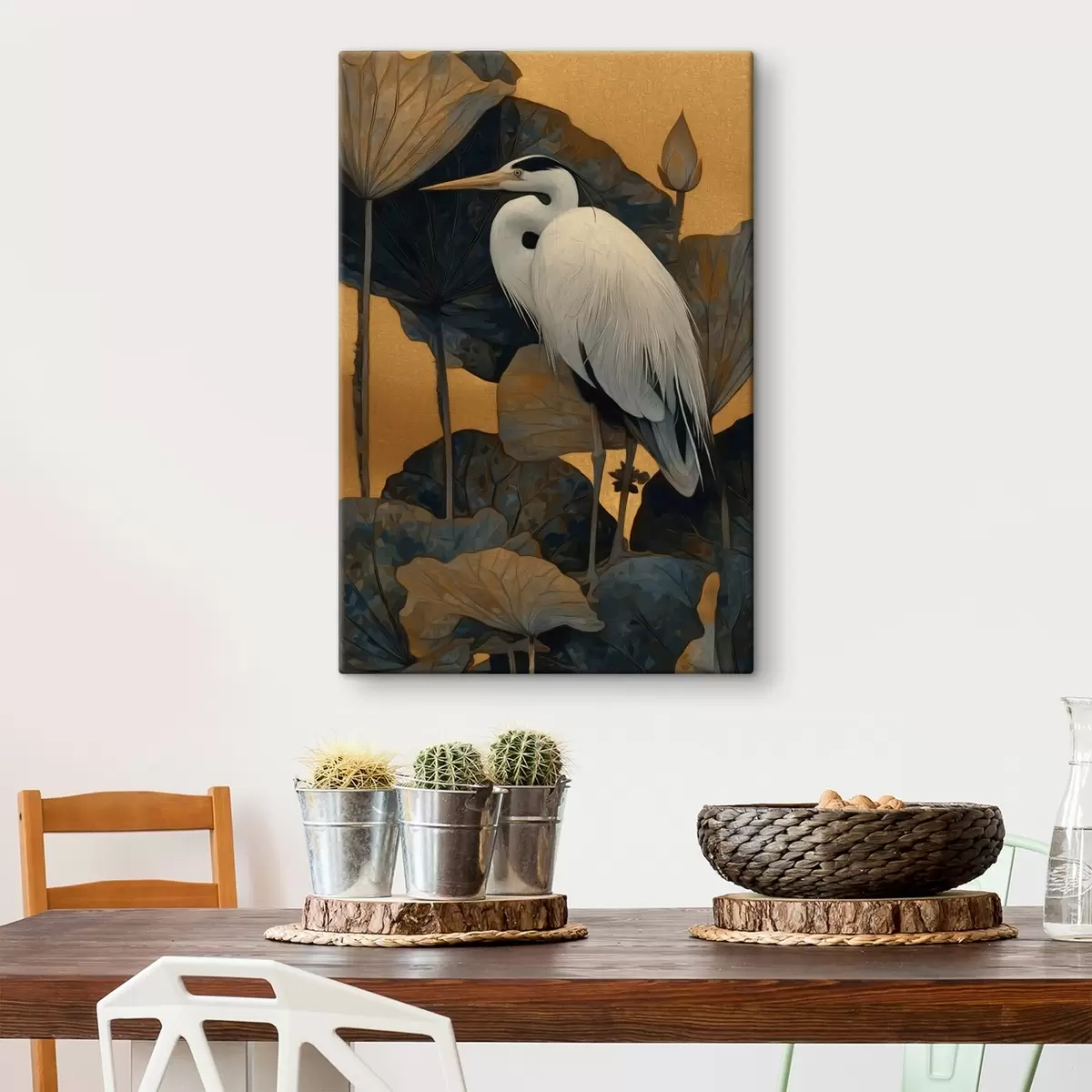 Schilderij Witte reiger tussen grote bladeren op een warme achtergrond Art. s46147