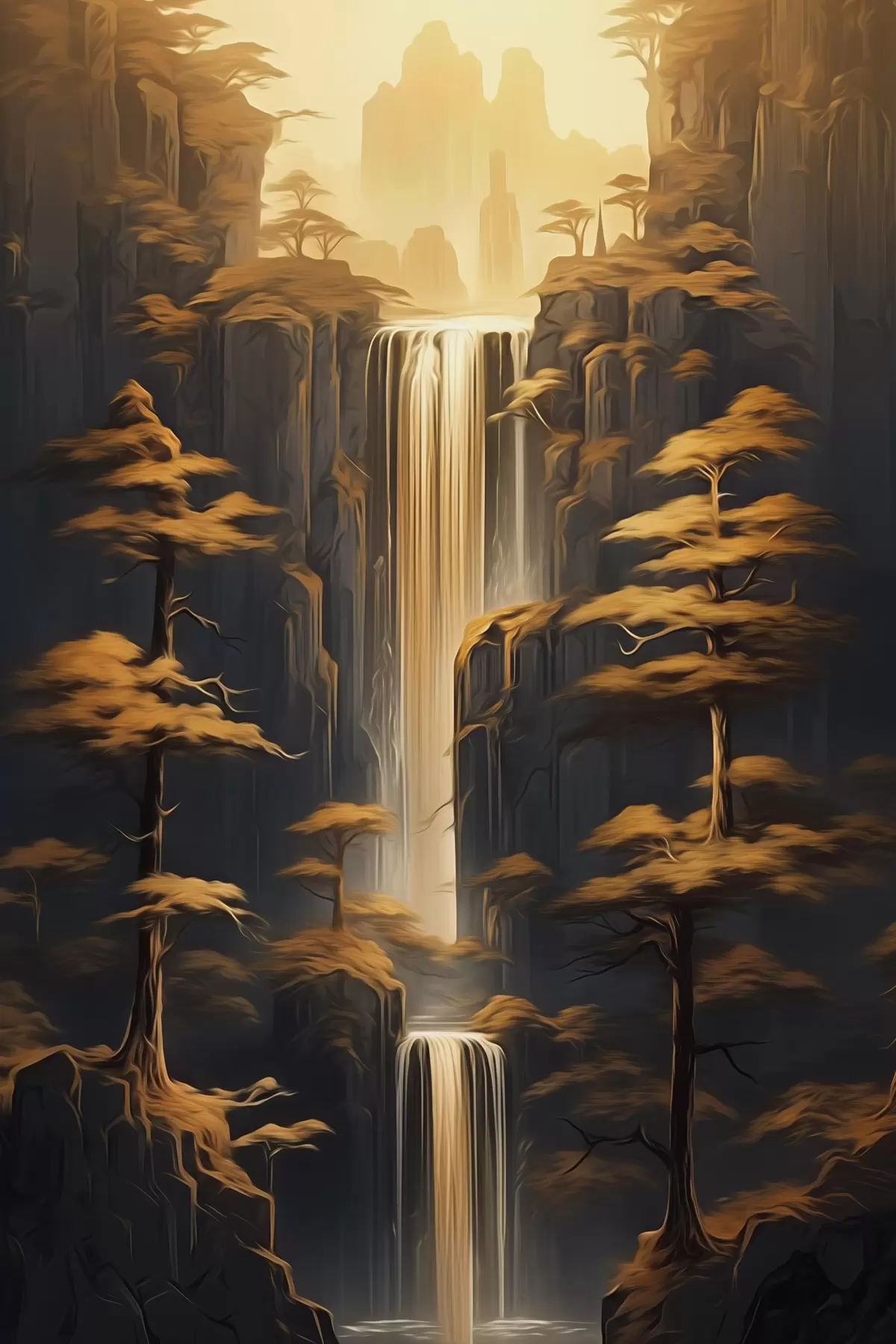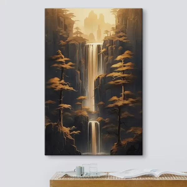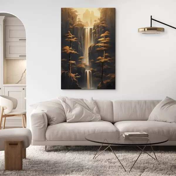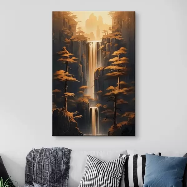 Schilderij Hoge kliffen met een waterval en dennenbomen in het avondlicht Art. s46151