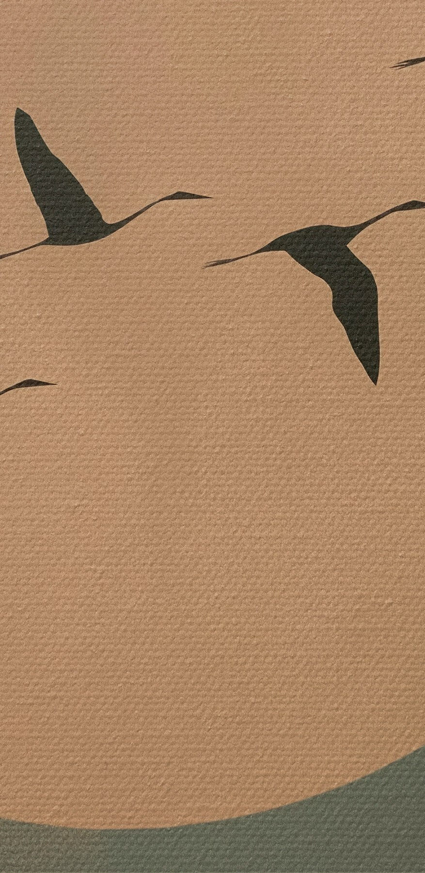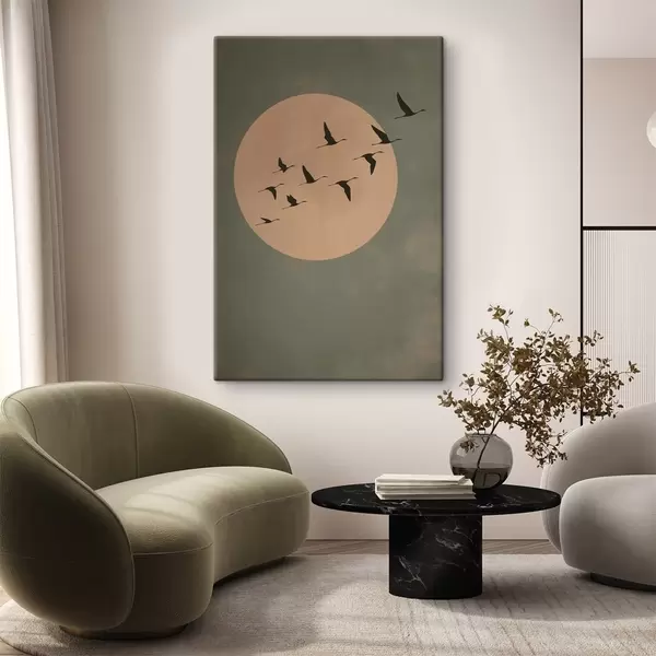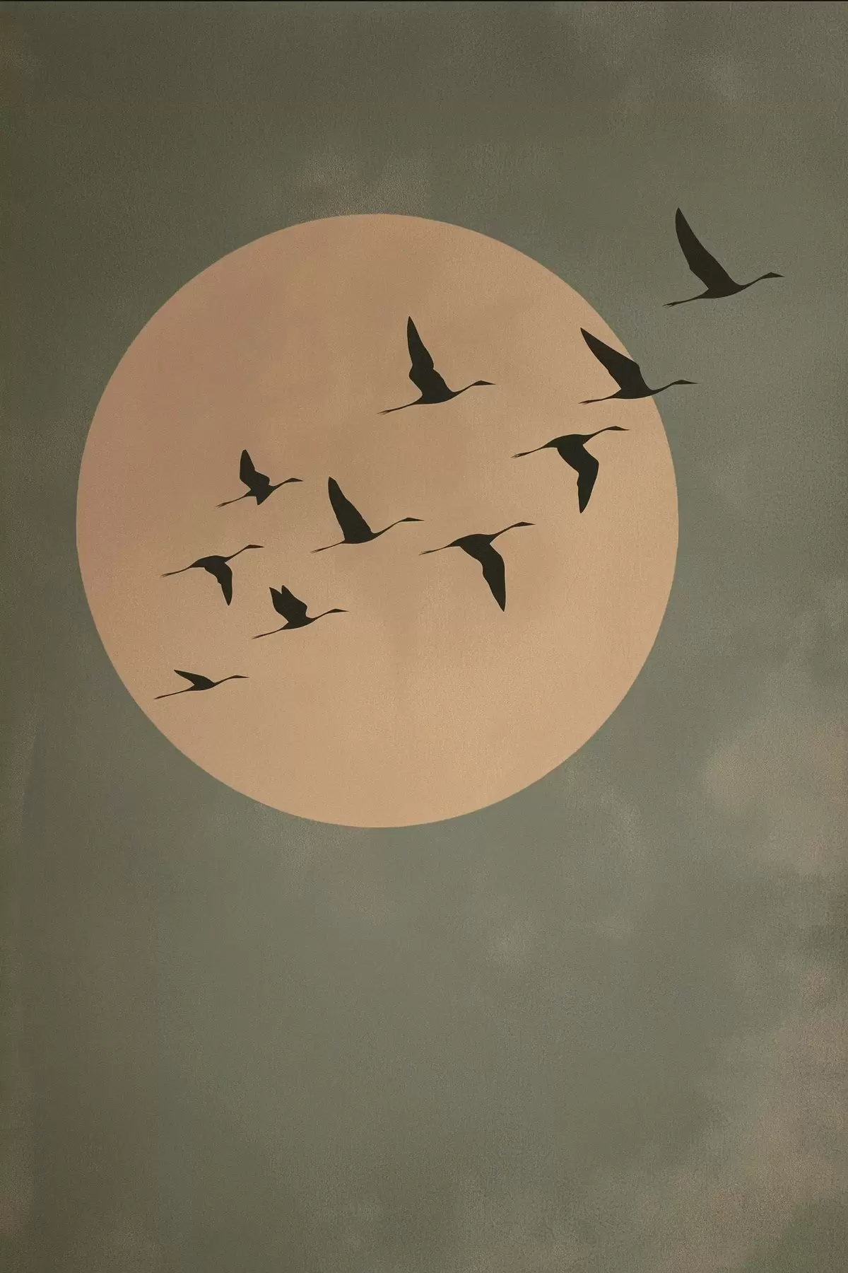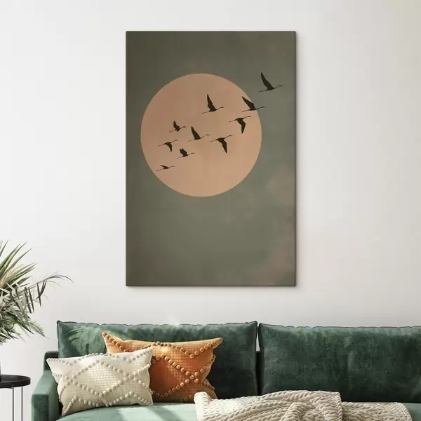 Schilderij Een zwerm vogels die tegen een grote warme maan vliegt Art. s46162