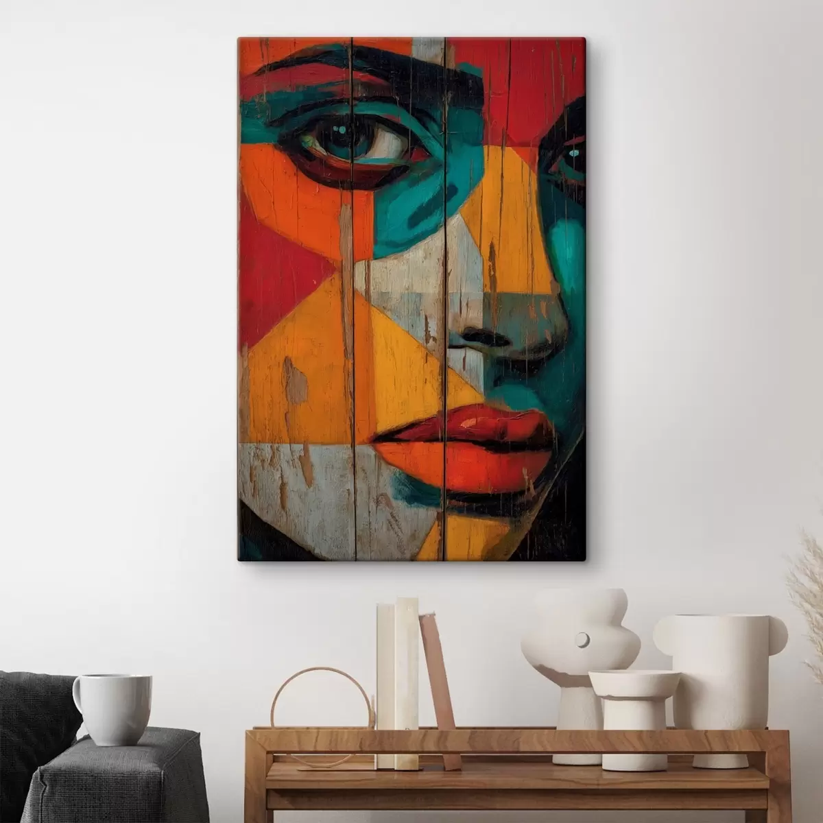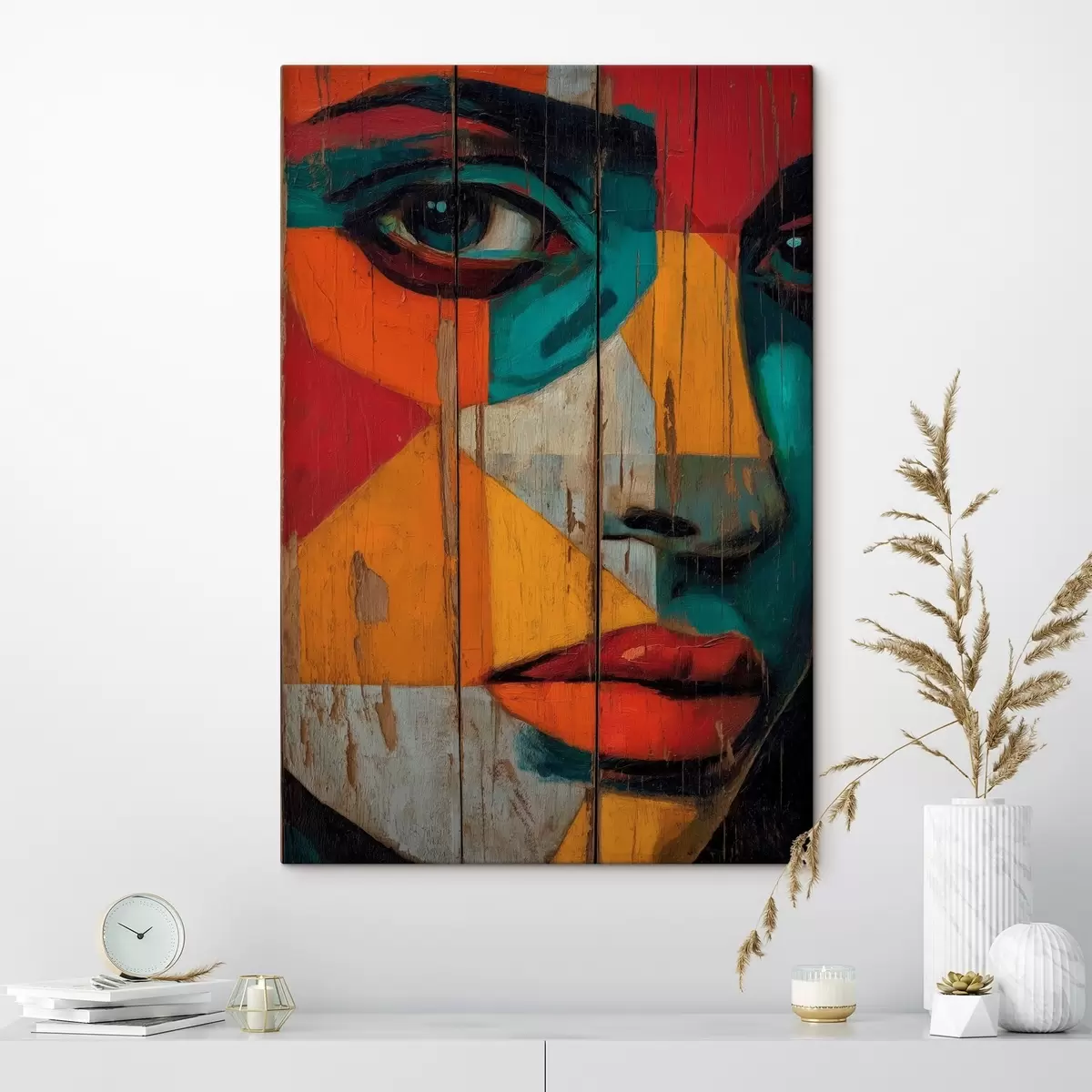 Schilderij Helder geometrisch portret op houten planken Art. s46165