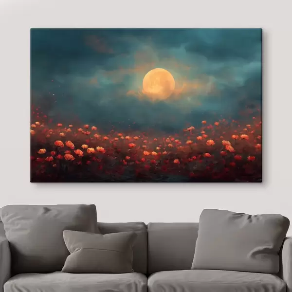 Schilderijen Maan boven een veld met rode bloemen in een mistige avondhemel s46167