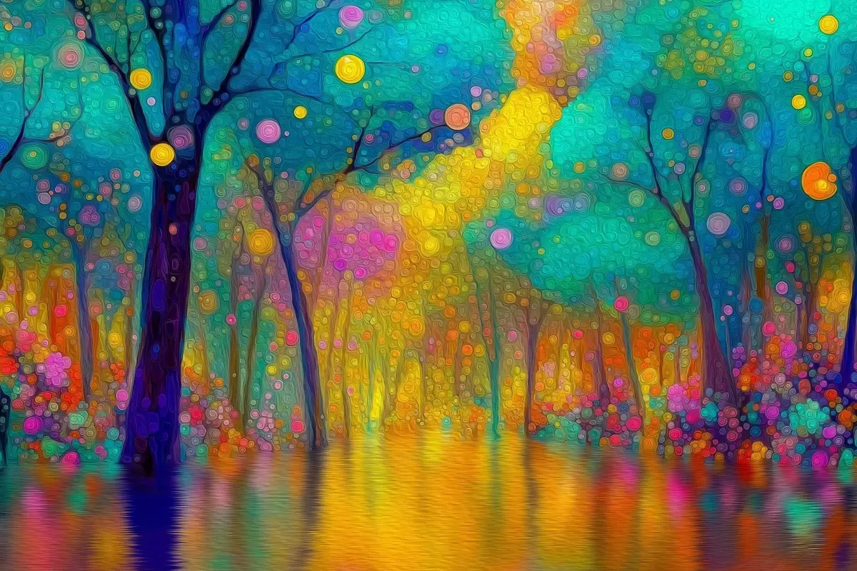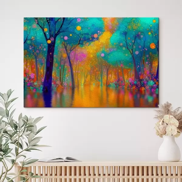Schilderij Levendig fantasiebos met weerspiegelingen in het water Art. s46171